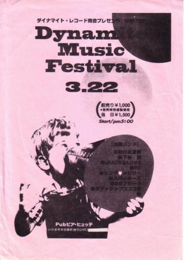 ダイナマイトレコード商会プレゼンツのチラシとしては、珍しく、イラスト無しのデザイン。 |