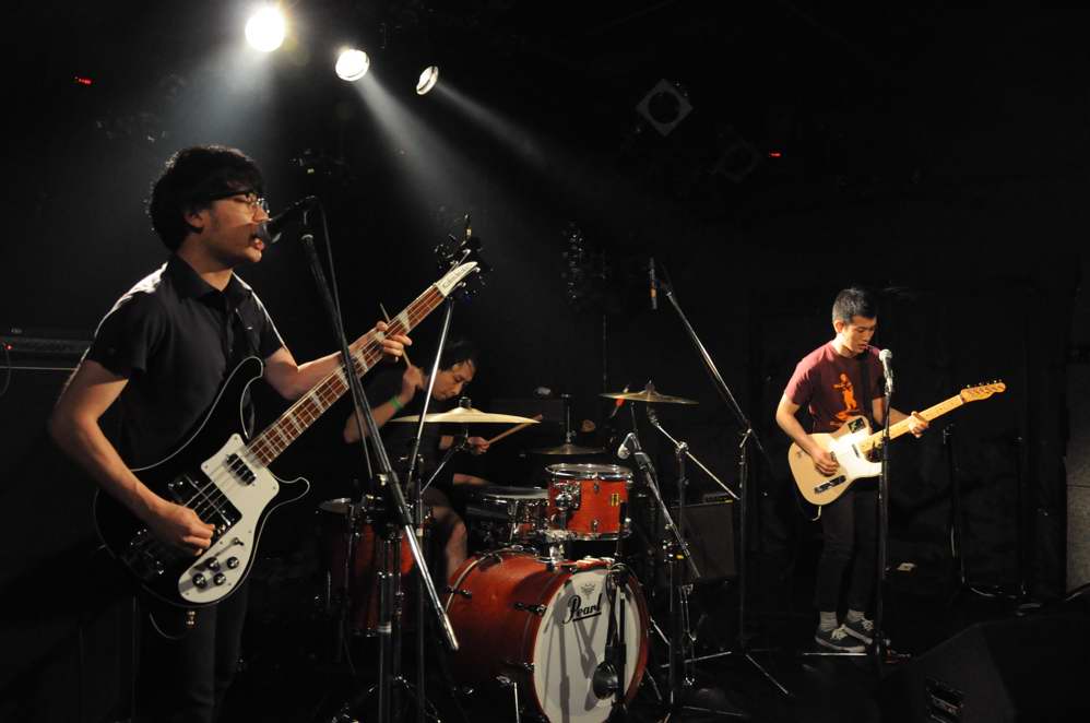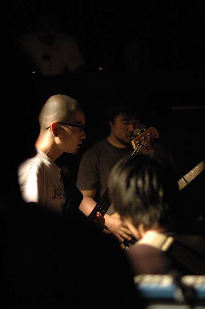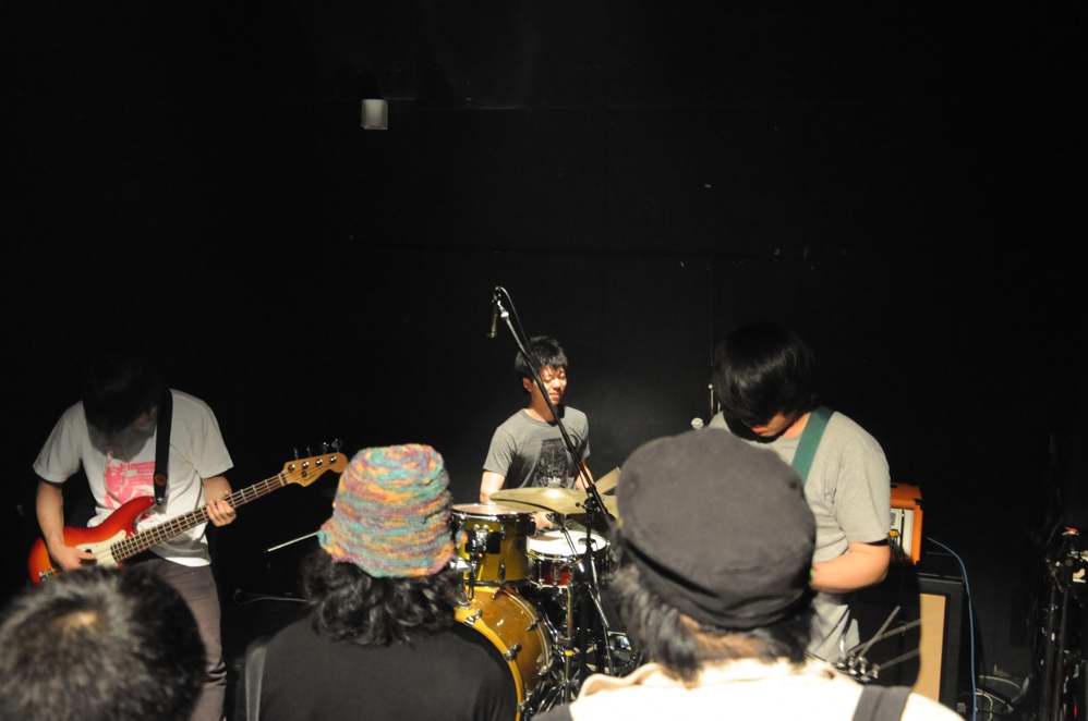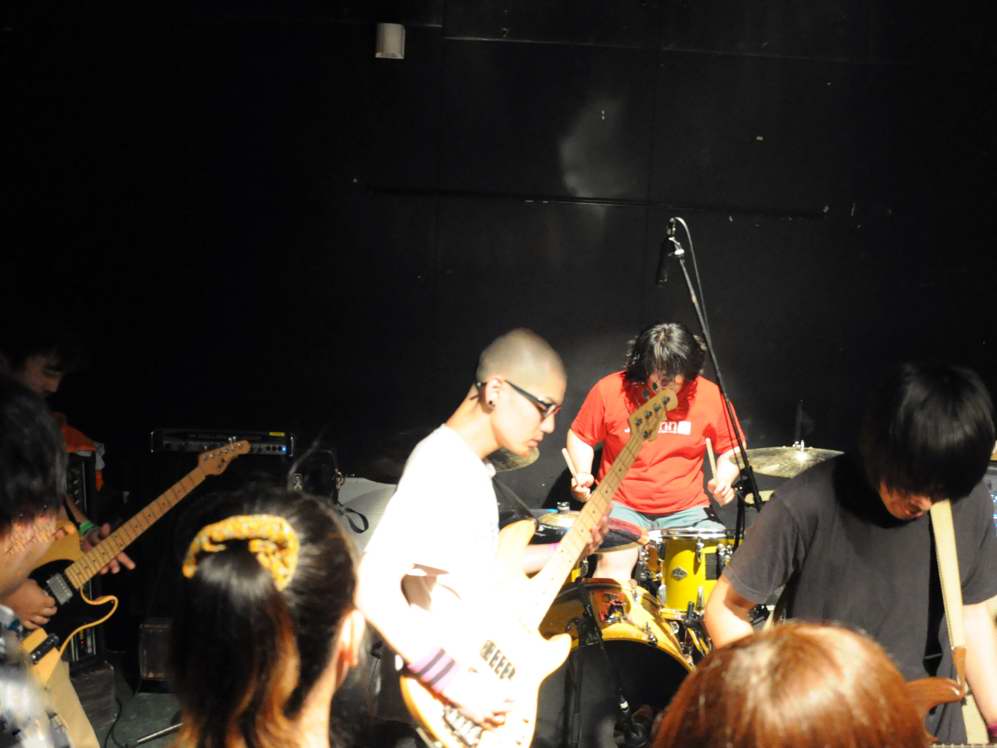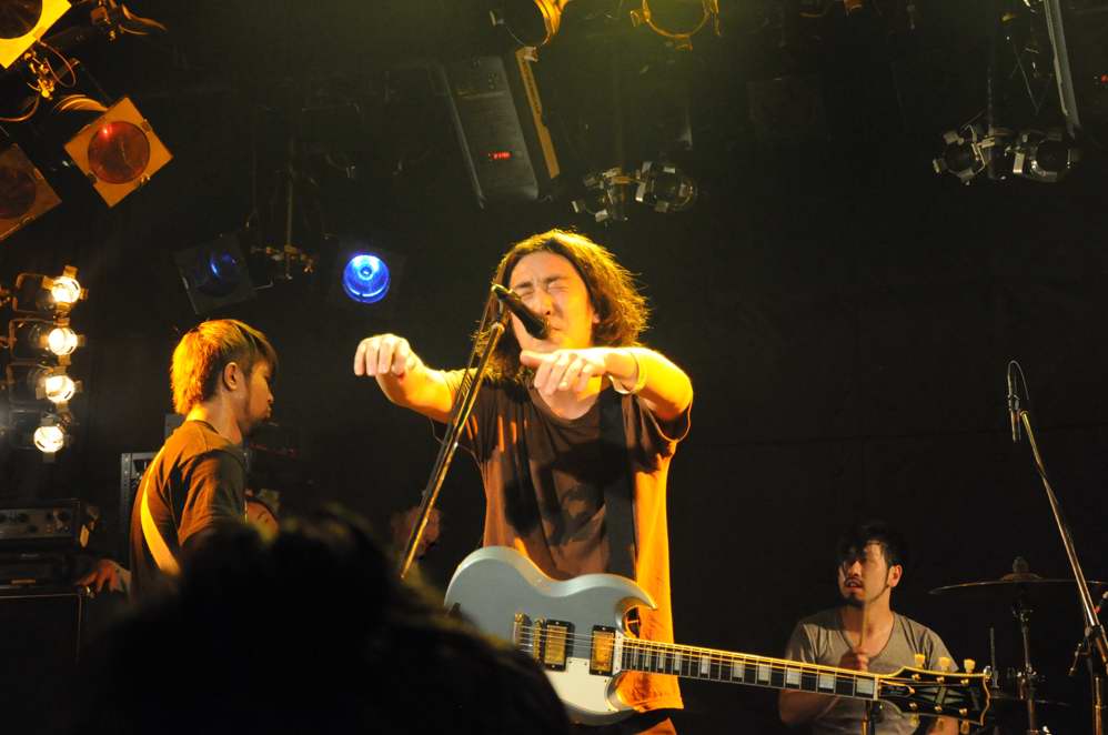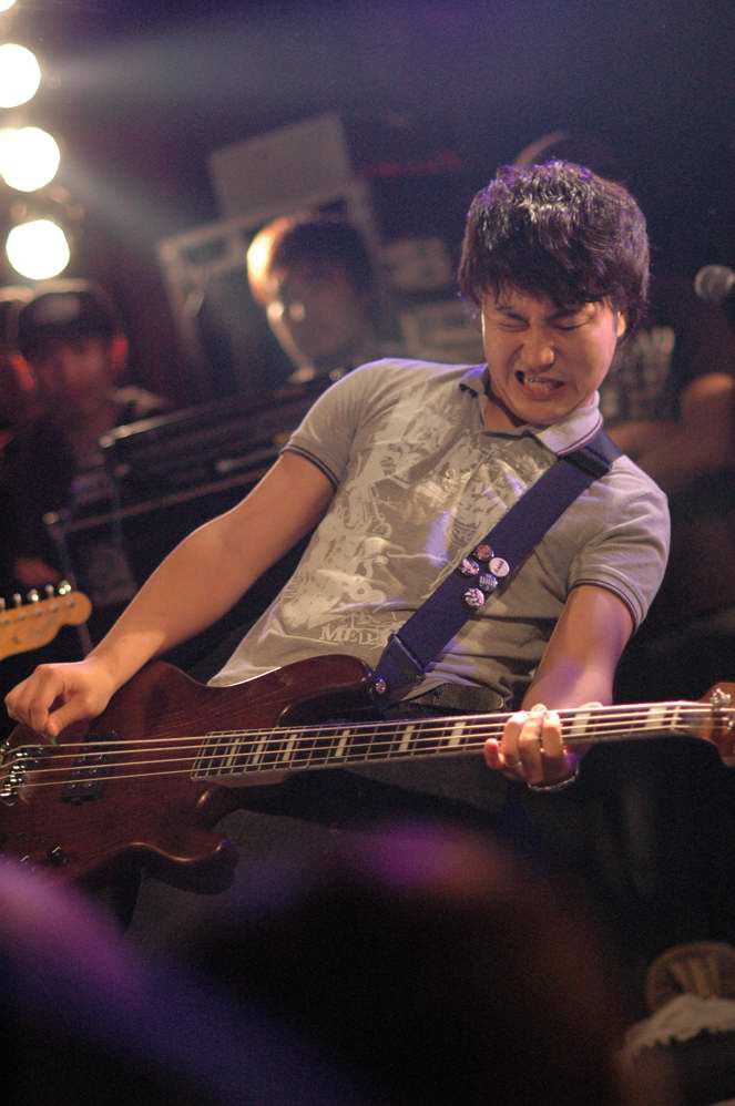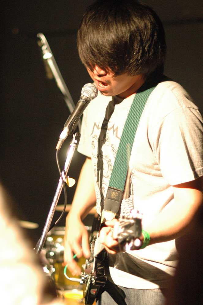 G(Vo),Ba,Drのトリオ。この日は、フロアをステージとして使用する 2ステージスタイルのライブで、フロアの方のオープニングはwakamiya。 激情、エモのシーンでは、注目の若手。荒っぽさと繊細さがブレンドしたフンイキが面白いですね。 バンド名は単純なのか、分けありなのか微妙ですが(苦笑)、 ストレートに迫ってくるサウンドの方は、小細工なしの本格です。 |