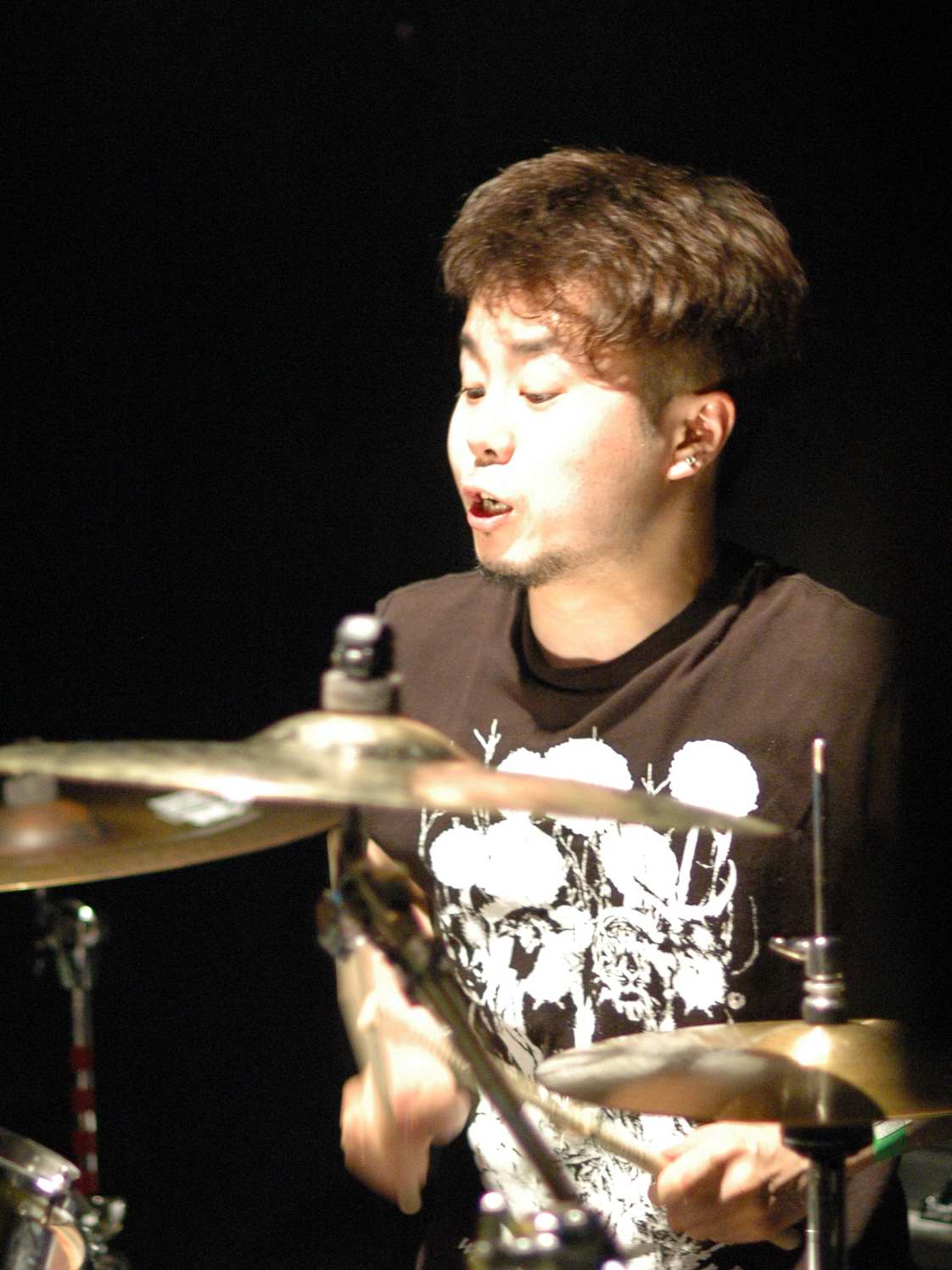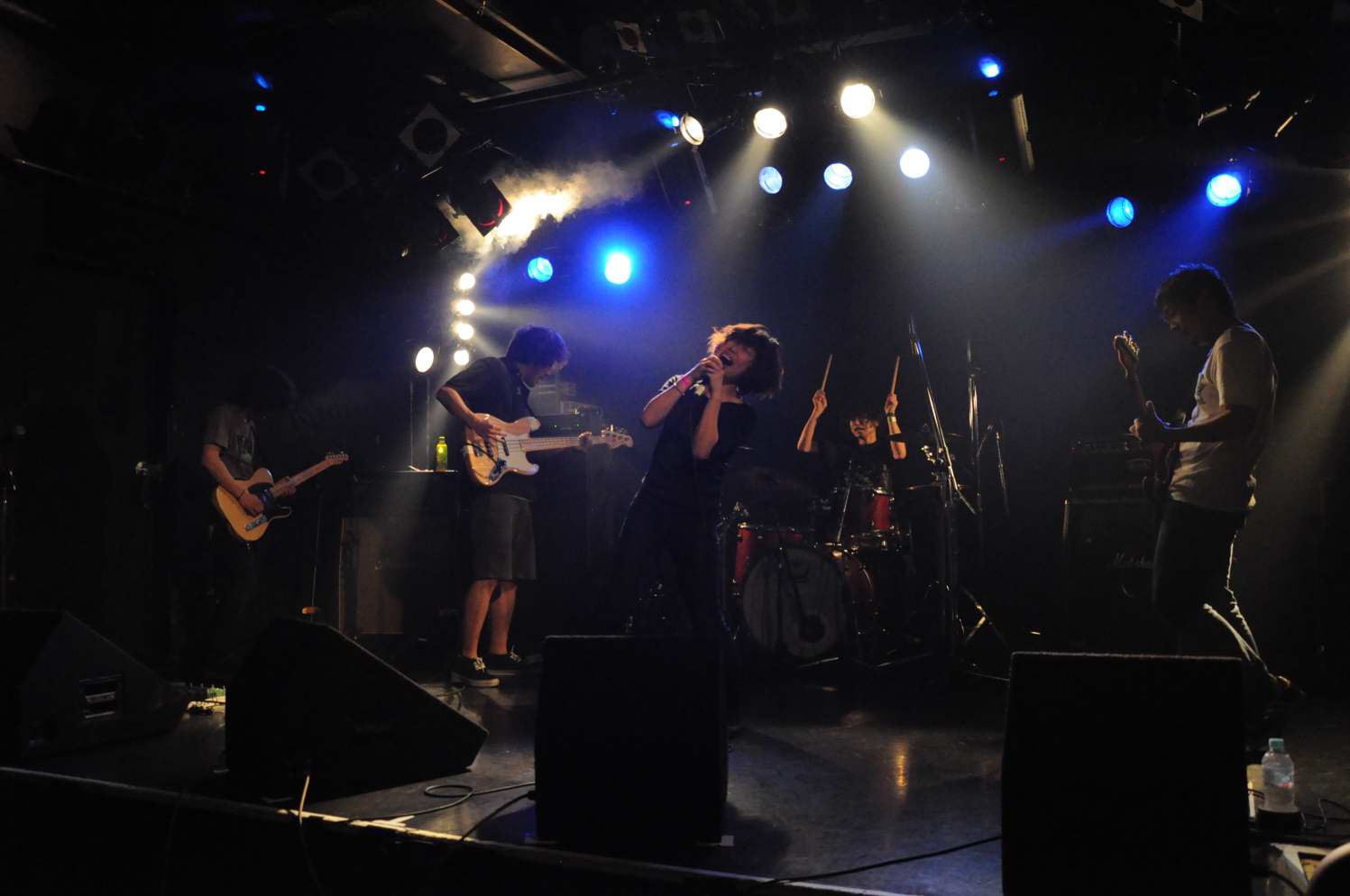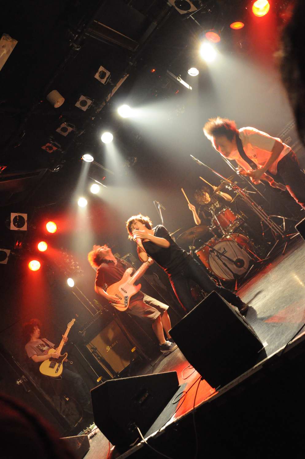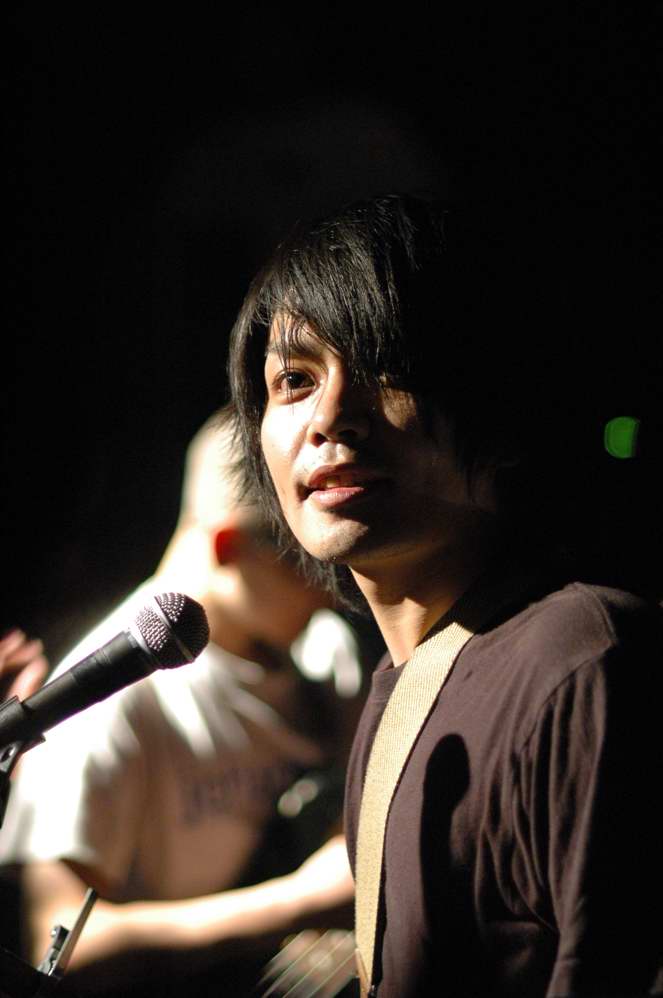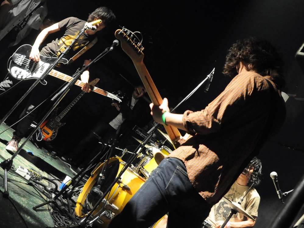 G(Vo),Ba,Drのトリオ。この日は、フロアをステージとして使用する 2ステージスタイルのライブで、フロアの方のオープニングはwakamiya。 激情、エモのシーンでは、注目の若手。荒っぽさと繊細さがブレンドしたフンイキが面白いですね。 バンド名は単純なのか、分けありなのか微妙ですが(苦笑)、 ストレートに迫ってくるサウンドの方は、小細工なしの本格です。 |