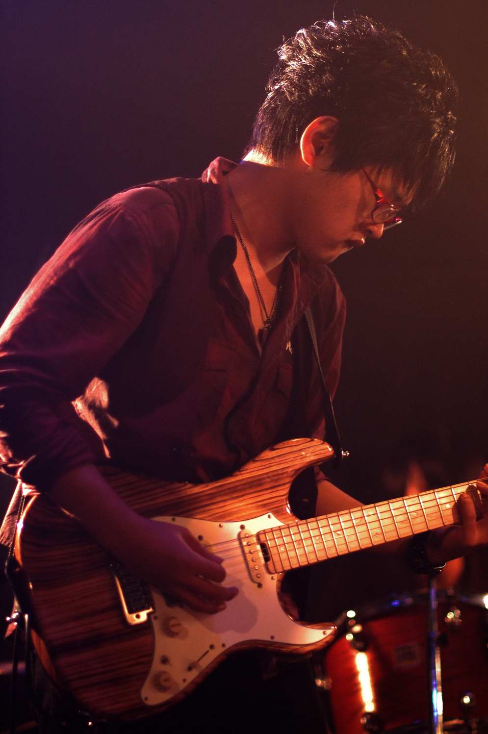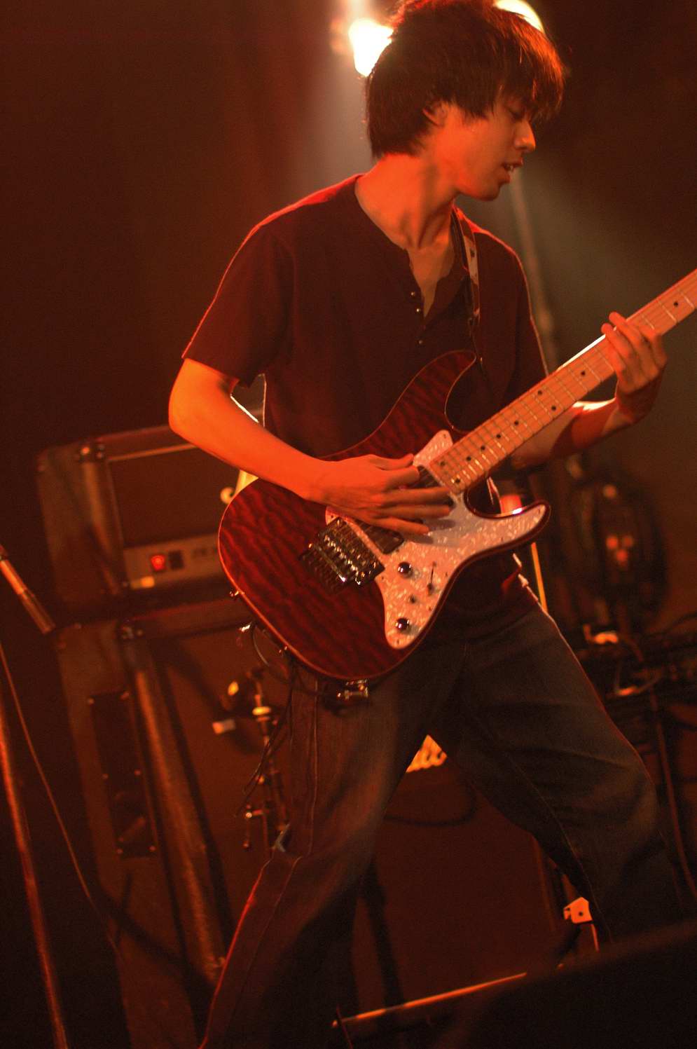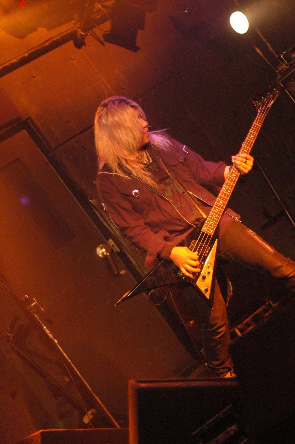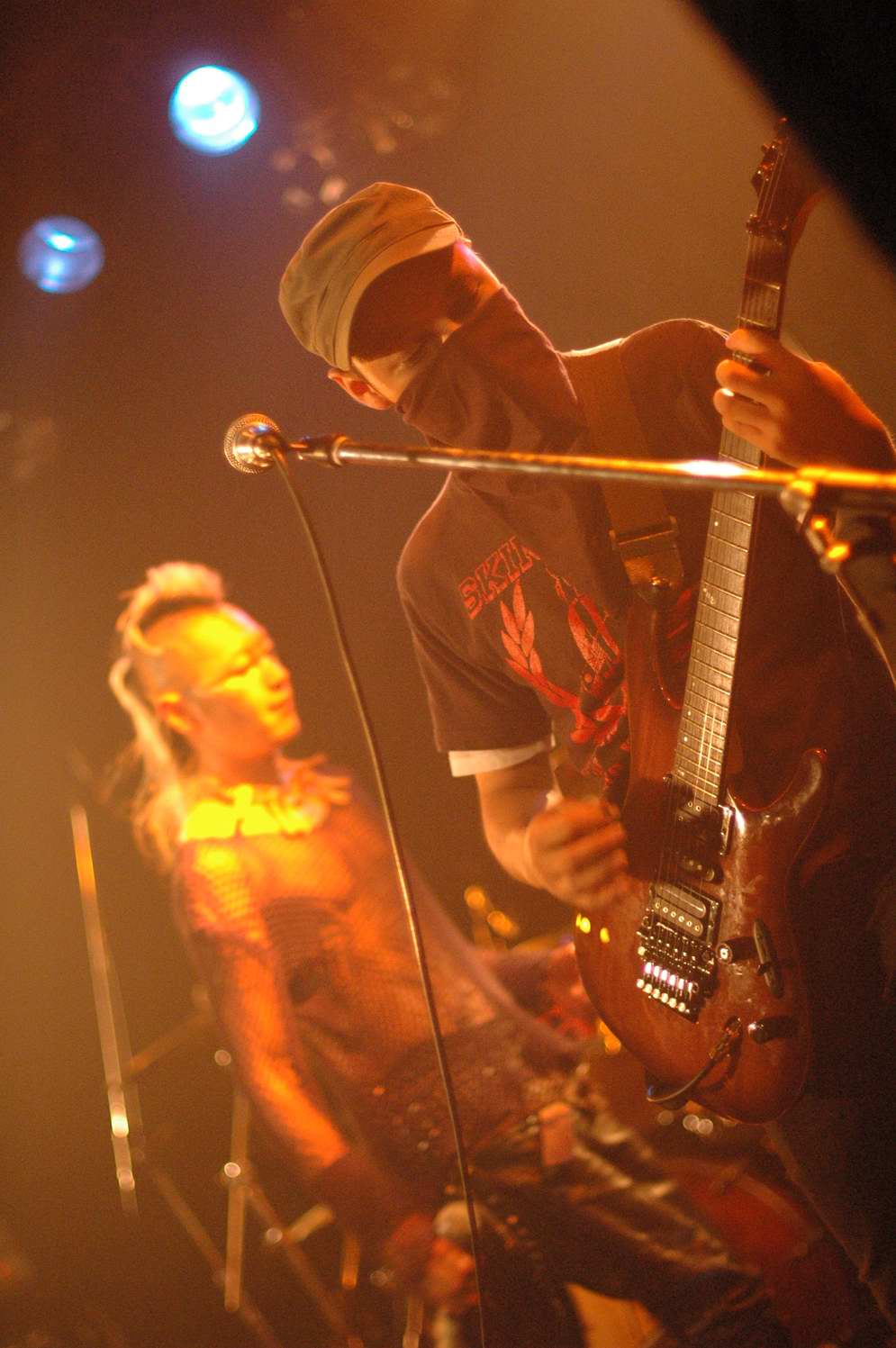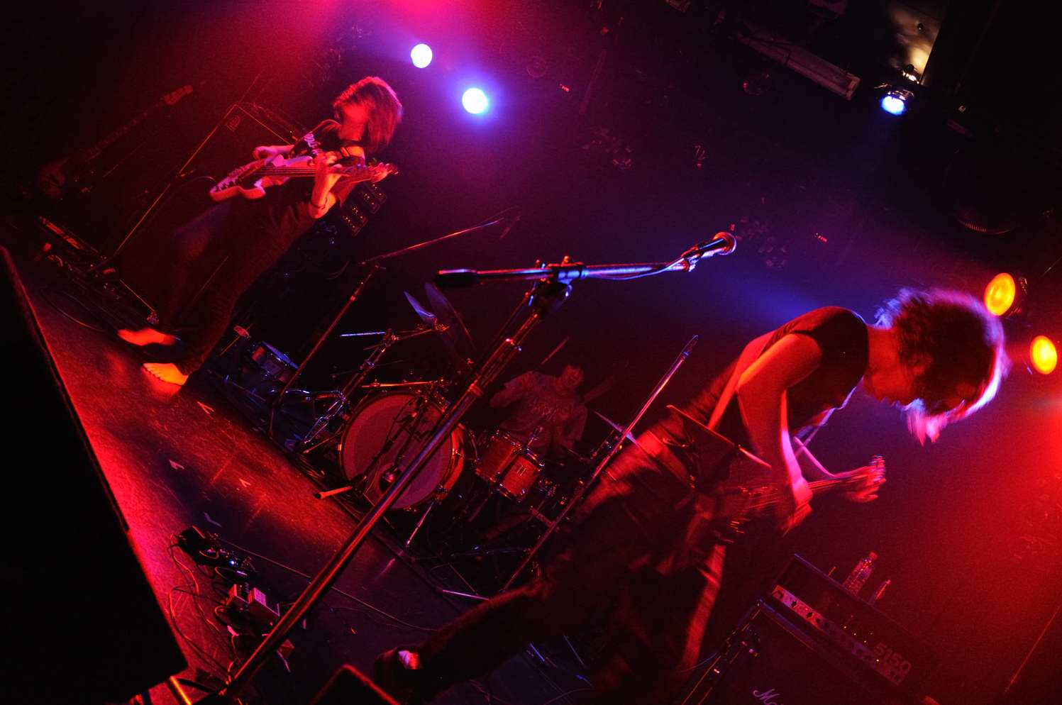 バンダナで顔を覆うギタリストと、鉄壁リズム隊のBa、Drも、バンドカラーにバッチリ染まっていて、