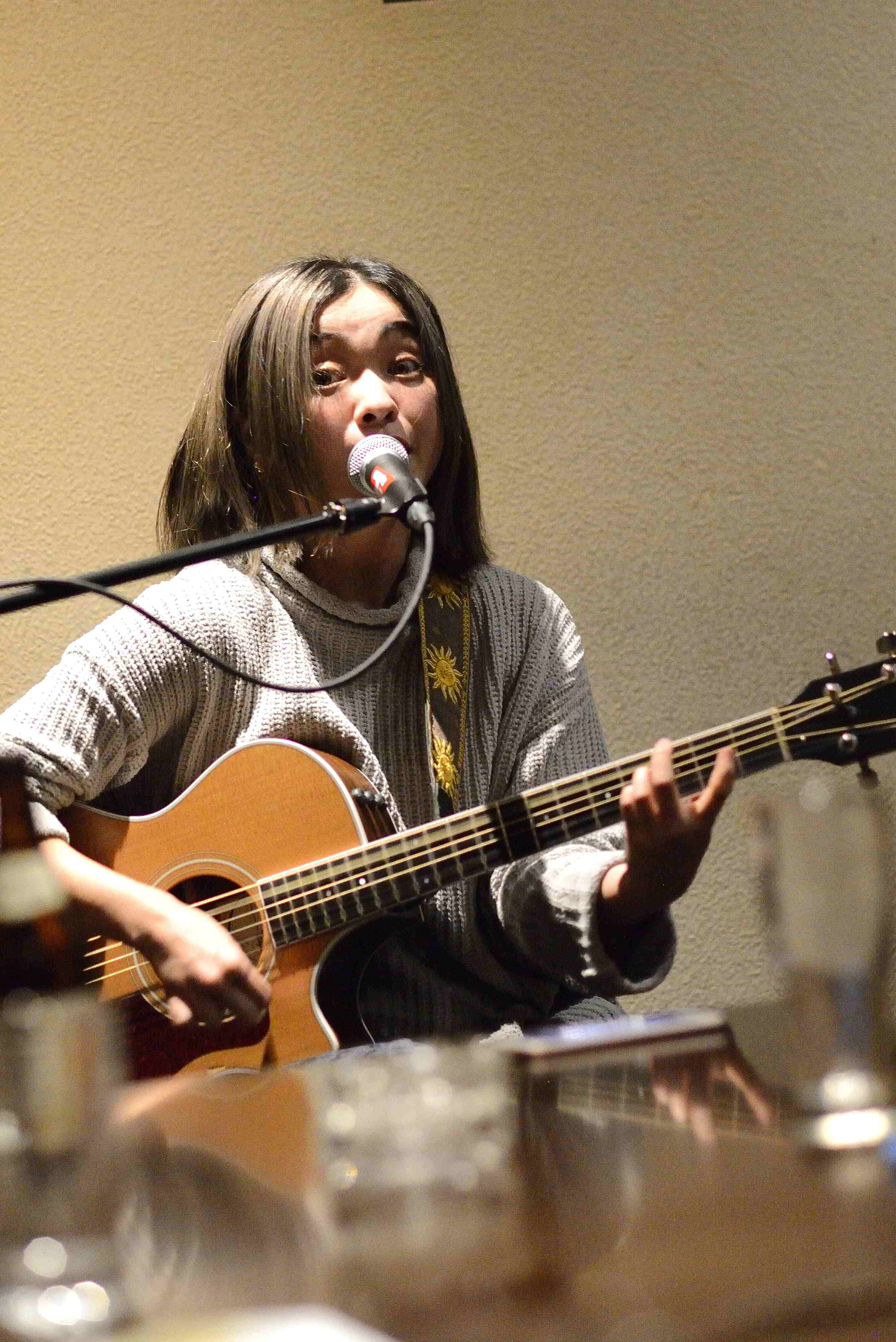 (4)摩耶 摩耶/まやさん、初めてライブ拝見しました。本人さんの口より語られた経歴?によると、栃木県出身で東京で活動、最近いわきへ転居、とのこと(多分、記憶違いでない事を祈るばかり)。ビックリするくらいの歌の上手さ、と言ったら失礼ですが、その後検索してみたところ、ボイスグループ『TakeOverTone』のメンバーとしても精力的に活動されているとのことで、納得感150%です。TakeOverTone』さんは”アカペラ+αで、より豊かな音楽を追求するVoice Groupとのことで、Youtubeでその活動を拝聴拝見することが出来ます。この日はバロウズ店長の花澤さんをパーカッションに迎えてのライブ。この御二方でのライブが何回目なのか?はてさて初めてなのか?とにかく、息の合った、演奏する御二方が本当に楽しそう、気持ち良さそうでした。歌詞、歌、演奏、そして楽曲、全てがかなりのハイレベルで、次にライブを見れる機会が楽しみですね。 |