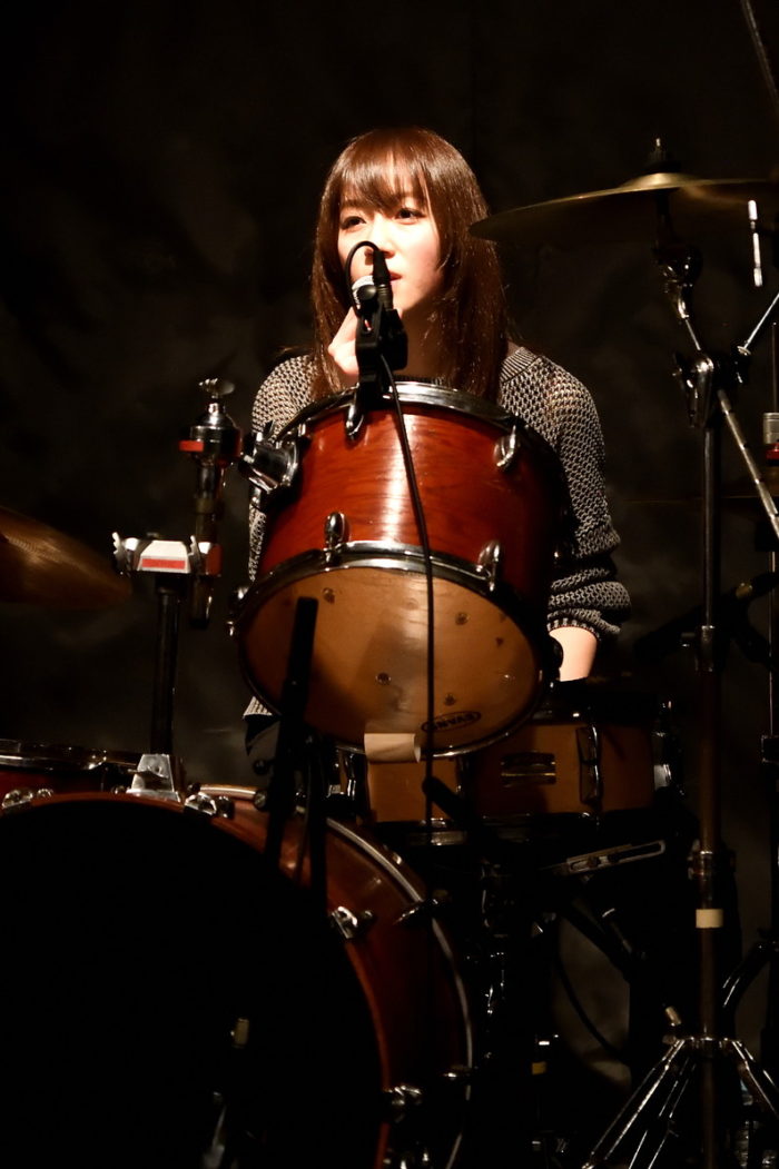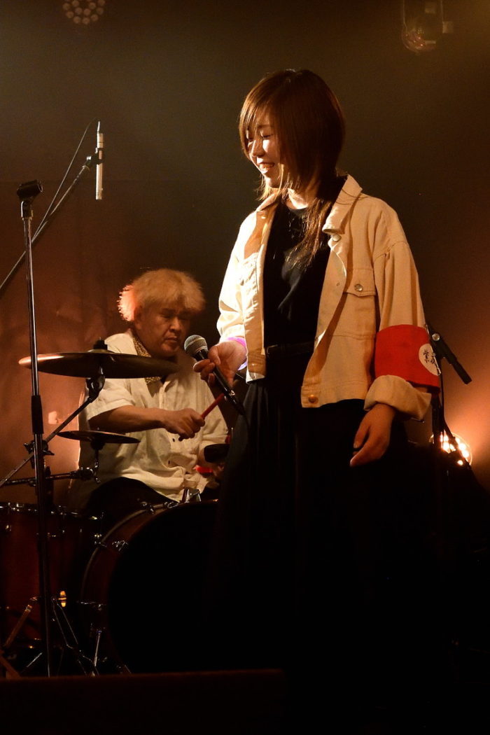 | (6)syasei 女性ボーカルを中心としたGt,Ba,Drの4人編成。バンド名は、そのまま”しゃせい”と読みます(苦笑)。イベントの企画者であるアツシさん(Dr)の、学園祭に出てみたいという野望発言が飛び出しました(苦笑)。フィフティーズ世代よりのワカモノ世代へのエールとしての”しゃせい礼賛”をベースに据えた「とても長いMC」は毎度の事ですが、まさに愛に溢れています。 「ぜったいいかない」、「今夜のおかず」等、ユーモアセンス?エロティックセンス?に溢れたコトバが飛び交います。 |