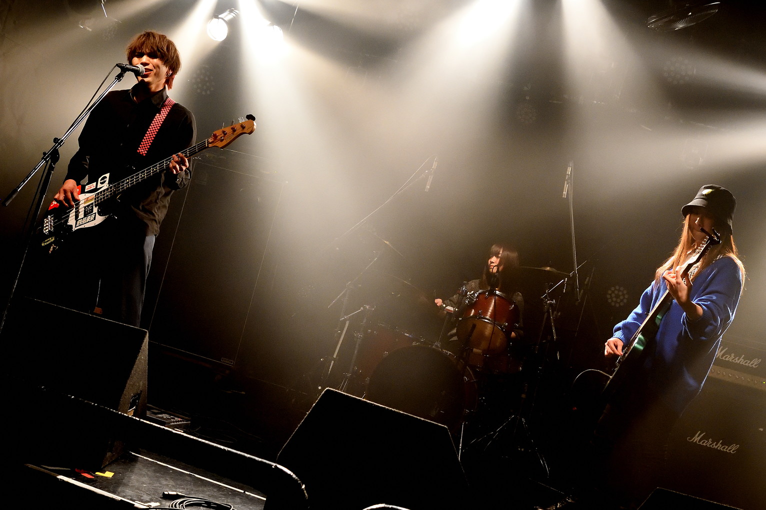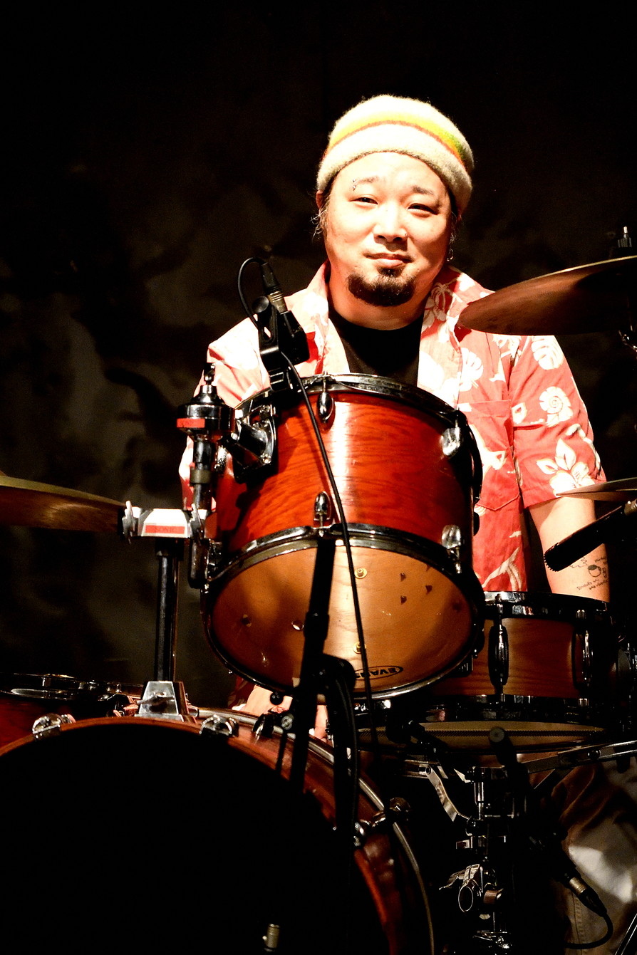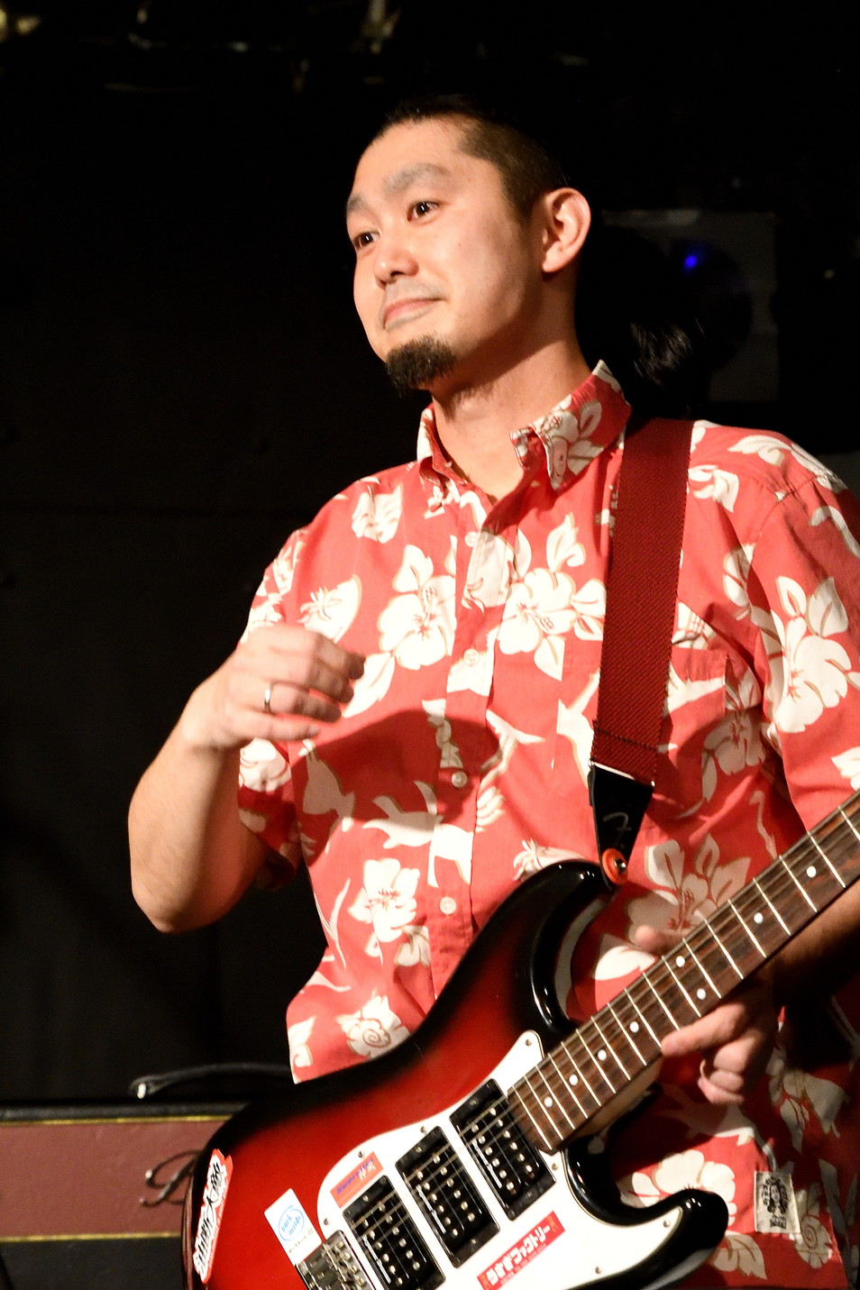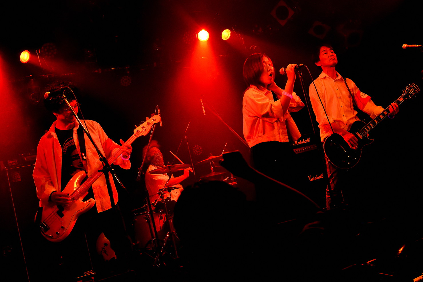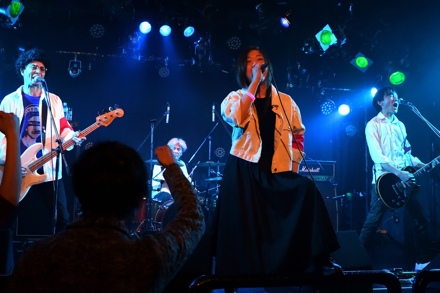 | (6)syasei 女性ボーカルを中心としたGt,Ba,Drの4人編成。バンド名は、そのまま”しゃせい”と読みます(苦笑)。イベントの企画者であるアツシさん(Dr)の、学園祭に出てみたいという野望発言が飛び出しました(苦笑)。フィフティーズ世代よりのワカモノ世代へのエールとしての”しゃせい礼賛”をベースに据えた「とても長いMC」は毎度の事ですが、まさに愛に溢れています。 「ぜったいいかない」、「今夜のおかず」等、ユーモアセンス?エロティックセンス?に溢れたコトバが飛び交います。 |
