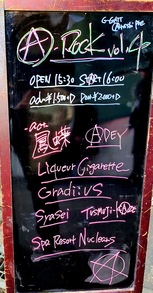 G-GATT ATUSHI Presents 出演(順に):(1)Spa Resort Nucleans (2)ADEY (3)Liqueur Cigarette (4)Gradi:us (5)鳳蝶 (6)syasei (7) TSUMUJI-KAZE