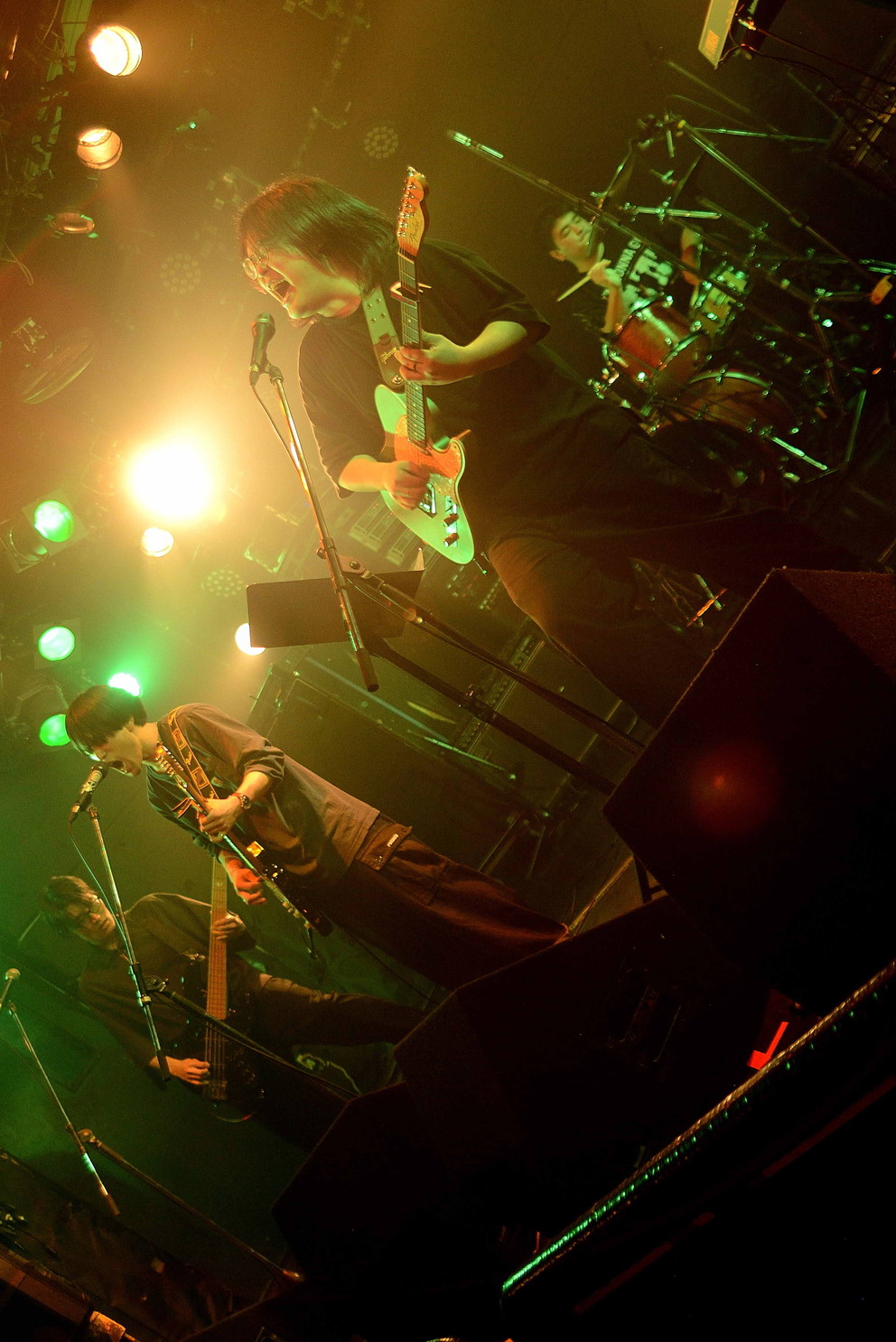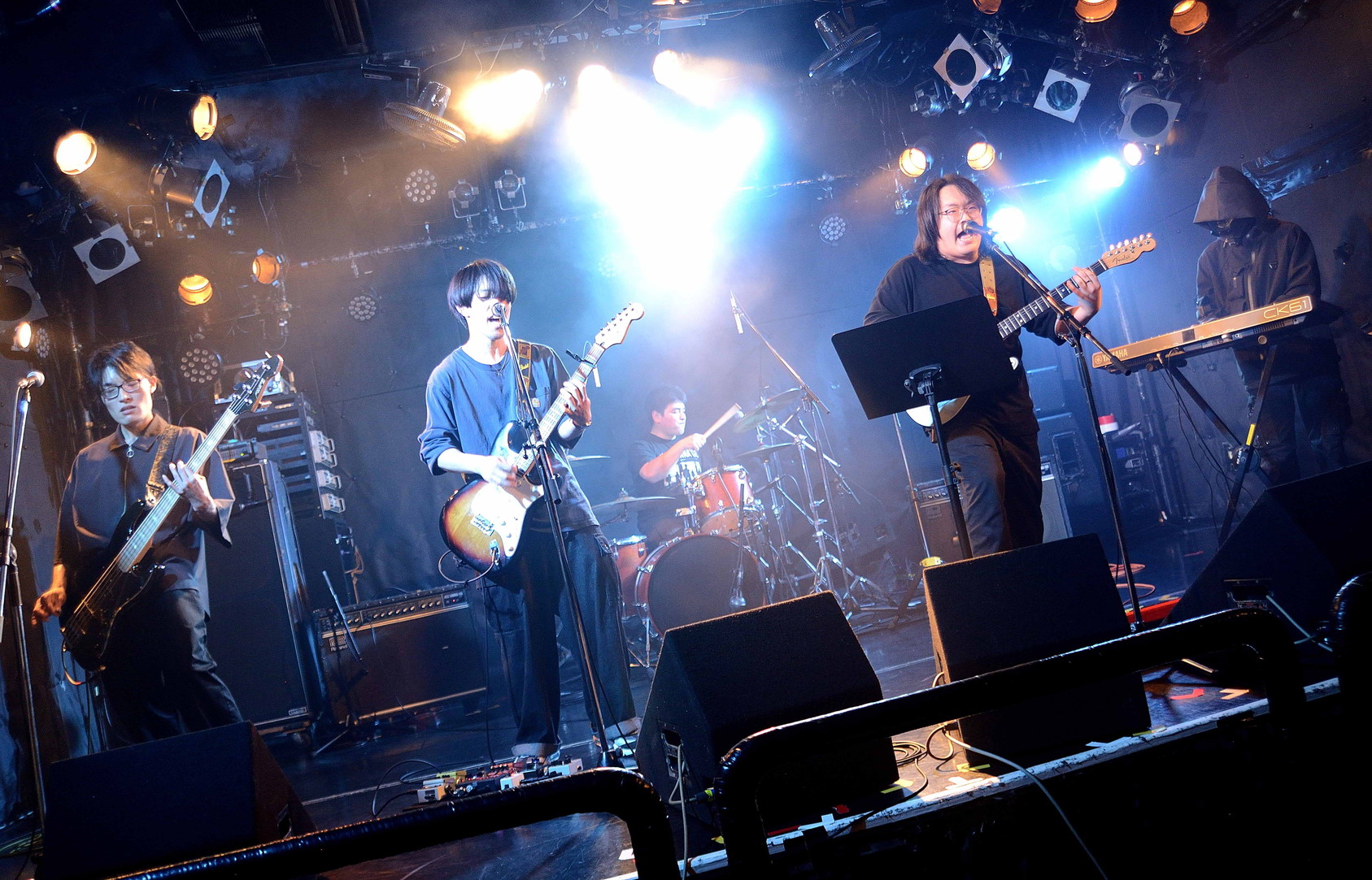 | (3)Liqueur Cigarette ツインギターの五人編成のバンドですが、前回2月に拝見したライブとだいぶ趣が変わっていて、新鮮な驚きに満ちたライブでしたね。上手側のギターさんが、メインにボーカルを取る曲が半分くらいあり、二人のギタリストが、曲ごとにメインボーカルを取るというスタイルのライブ。ボーカルスタイルは、全くタイプが違う?と思いますが、どちらも魅力的ですね。ハイテンションで始まってハイテンションで幕を閉じた熱いライブでしたね。keyさんは顔をスッポリ覆っていたりして異様な雰囲気だし(苦笑)。 |