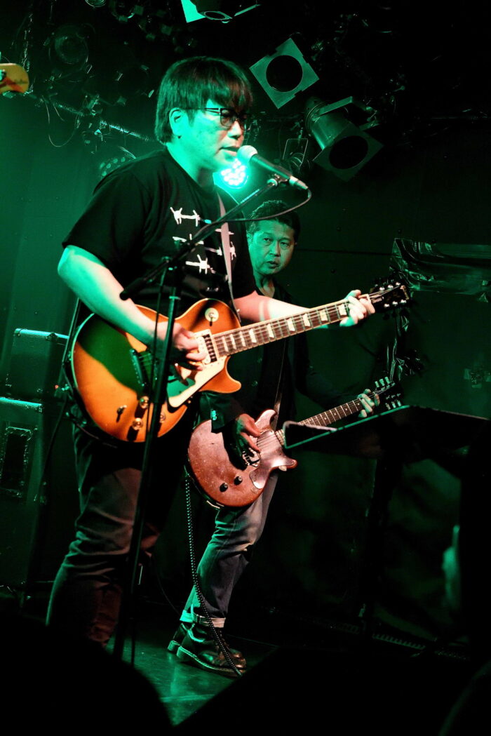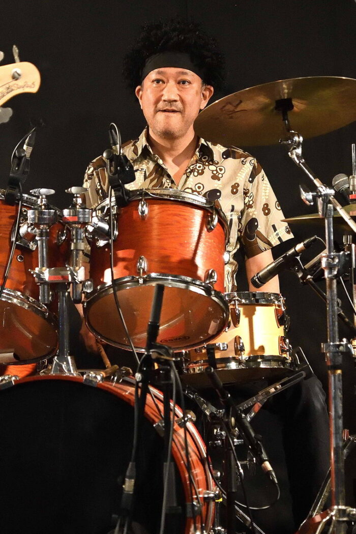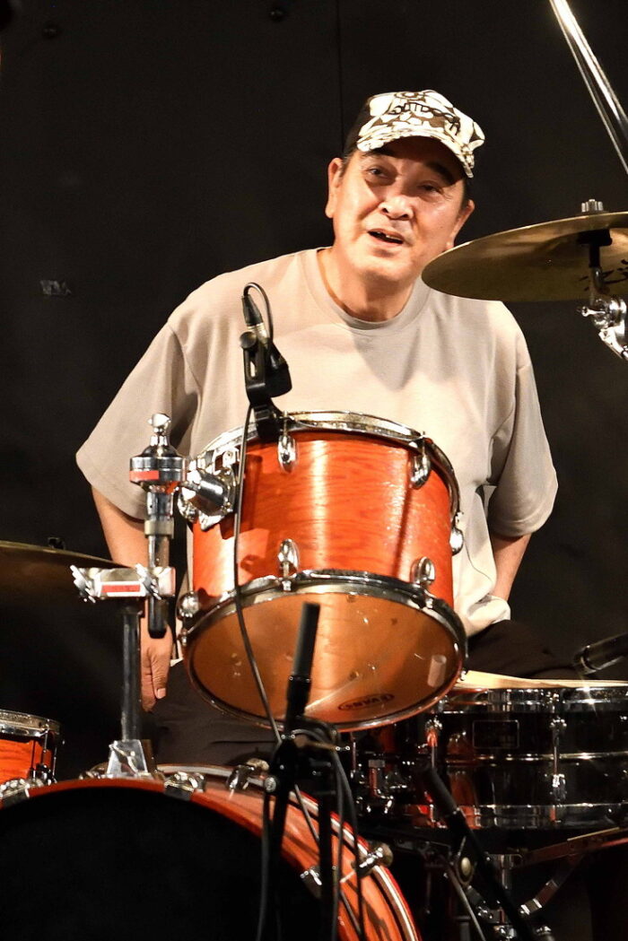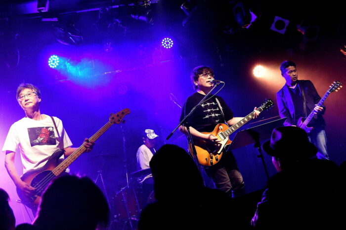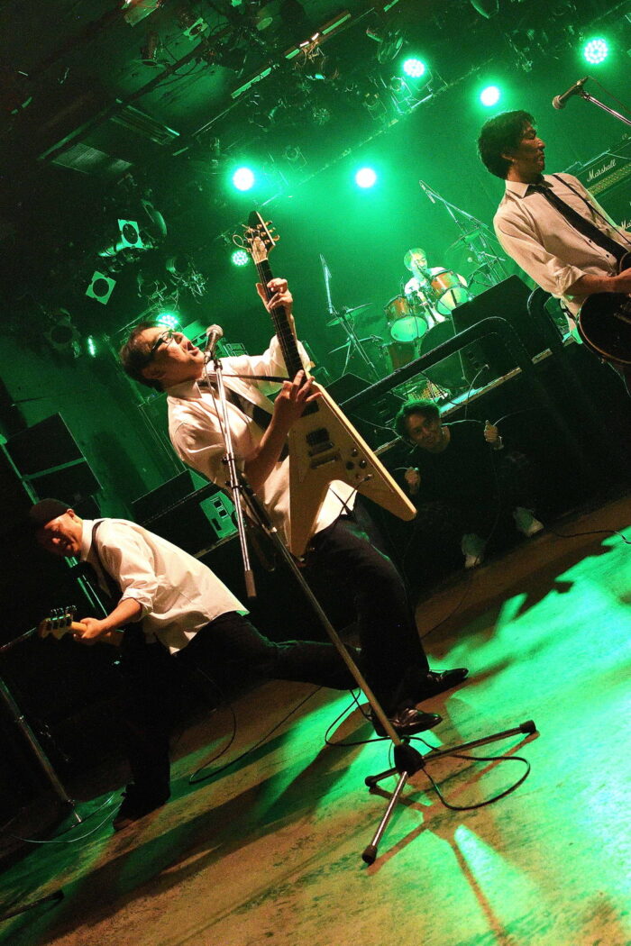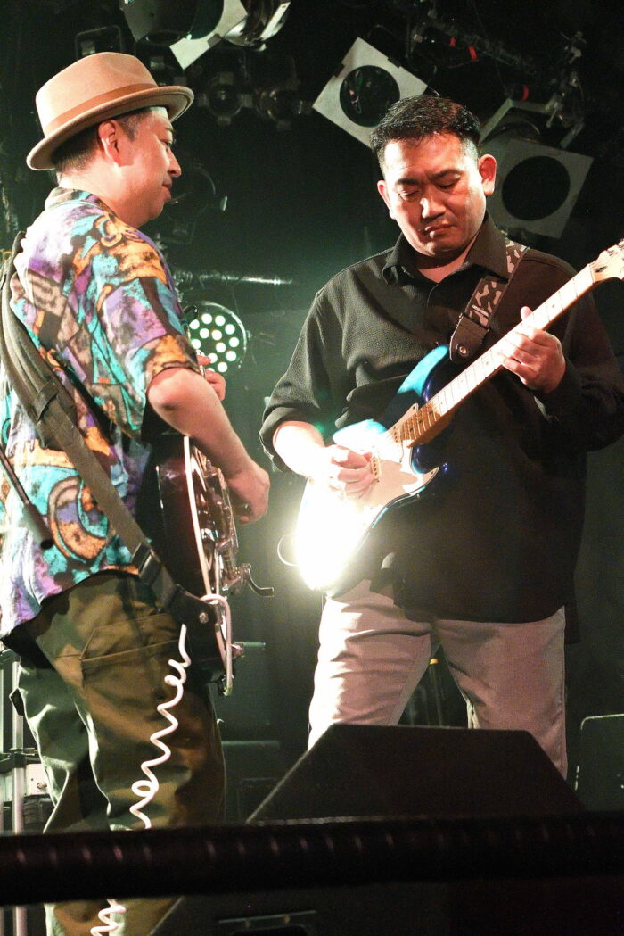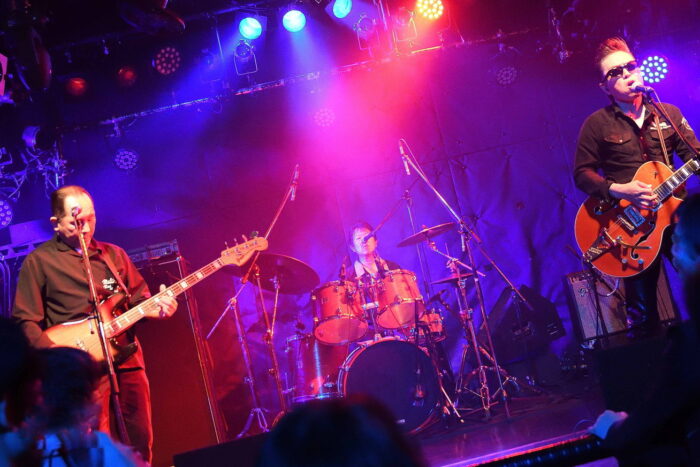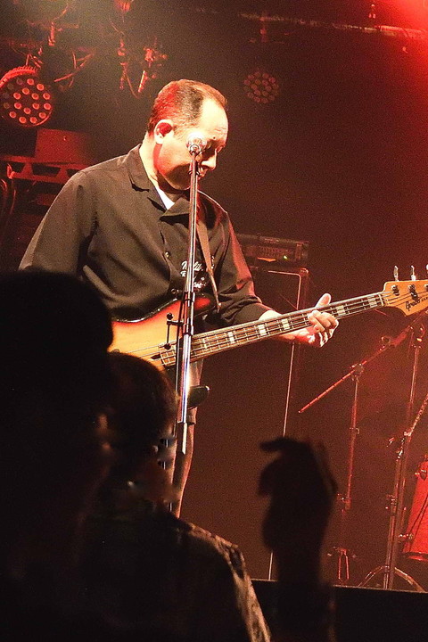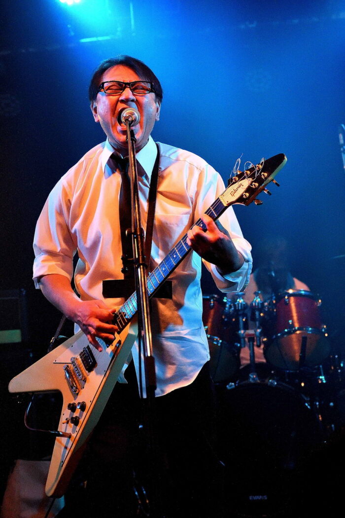 | (6)ゴールドブレンダーズ Vo(Gt),Ba,Drのトリオ編成。昭和な感じで楽しませてくれました。キャディラックのカバーから活動を開始したという事からもそのセンスが伺えるというものです。キャディラックの3曲のカバーを含め、懐かしい定番の曲をタップリと聞かせてくれました。ツッパリハイスクールロックンロール、ルイジアンナ、スニーカーブルース、ハイティーンブギ(ロカビリー調のアレンジが渋い)。 |