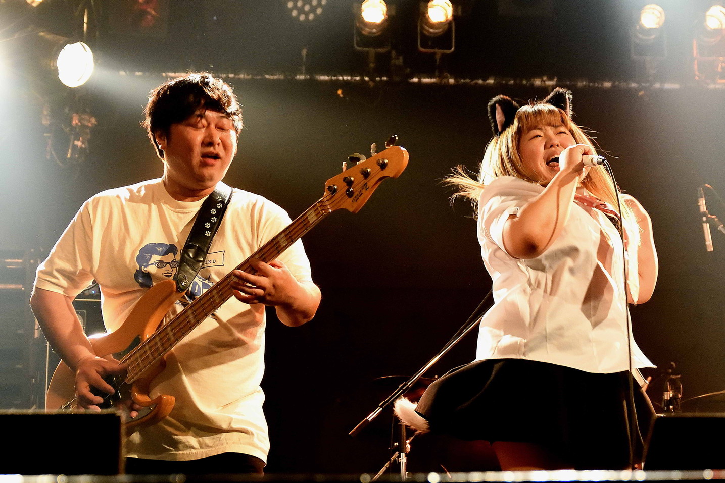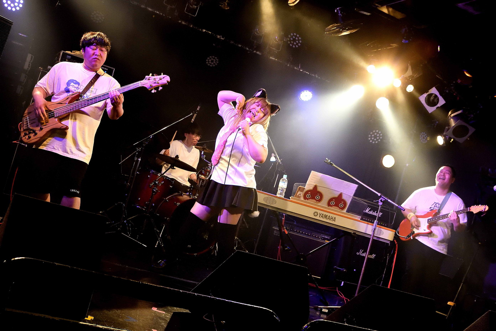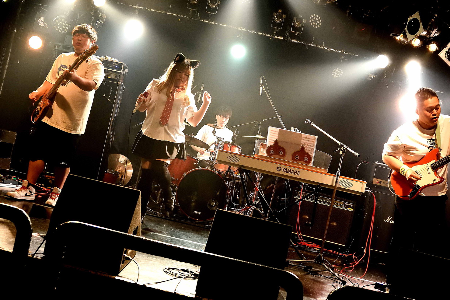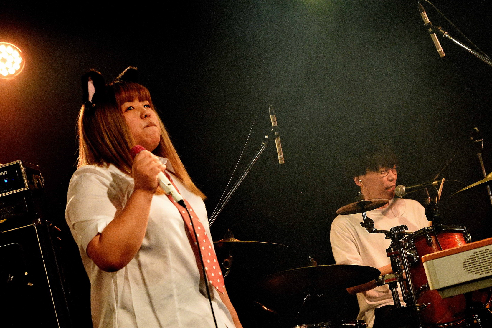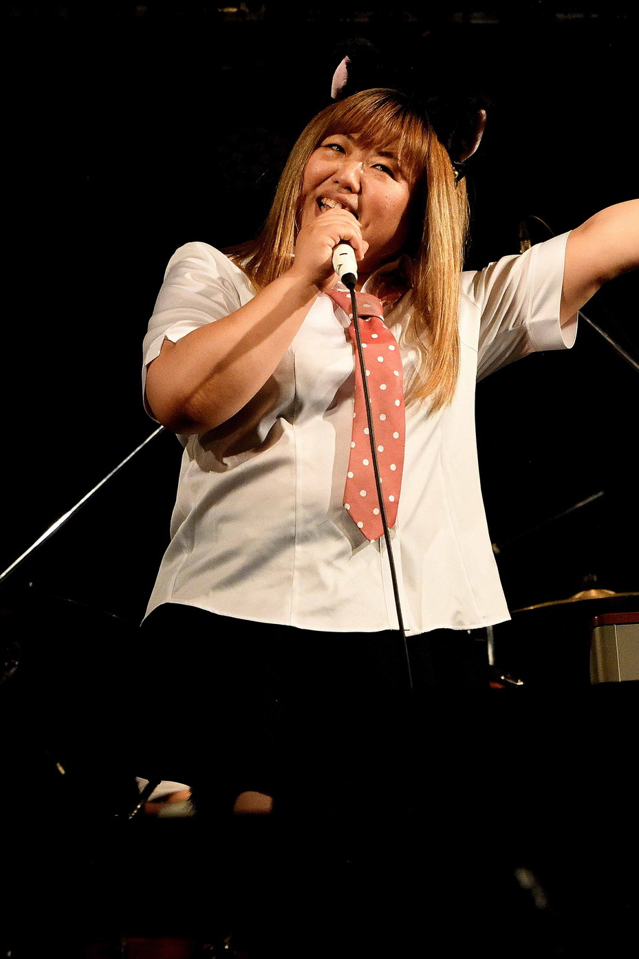| (1)team lidra Vo(Key),Gt,Ba,Drの四人編成で、「ボーカル・あたん」さんを中心に、アニソン、ゲームソングを超熱く演奏してくれます。あたんさんは、かわいい、が職業の300年生きているネコ、という設定らしいです(ちょっと違っているかも)。Gt,Ba,Drを務める三人が並行して続けているバンド活動が何気にスゴイですねぇ。正直、アタシのような昭和世代の理解を超えているのですが、楽しませてもらいまいした。 |