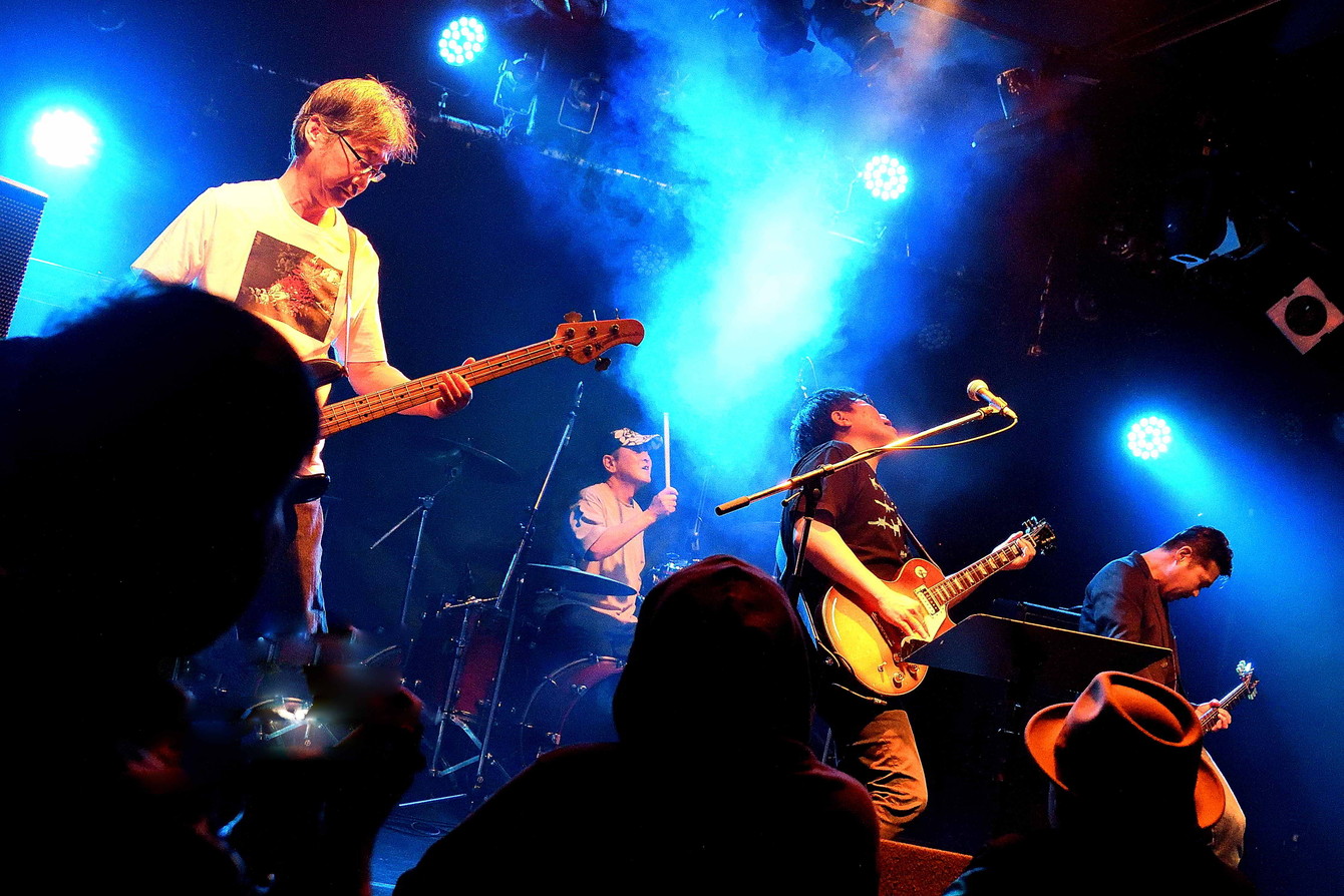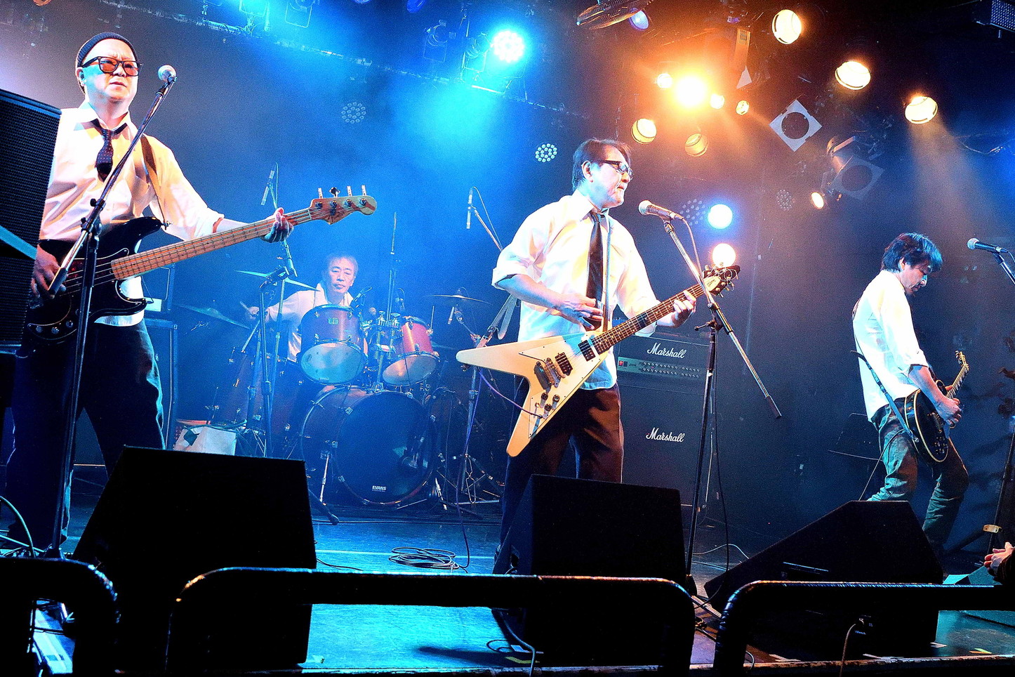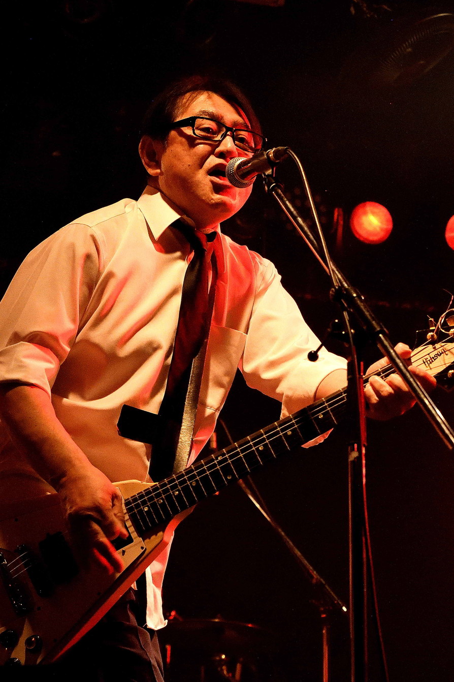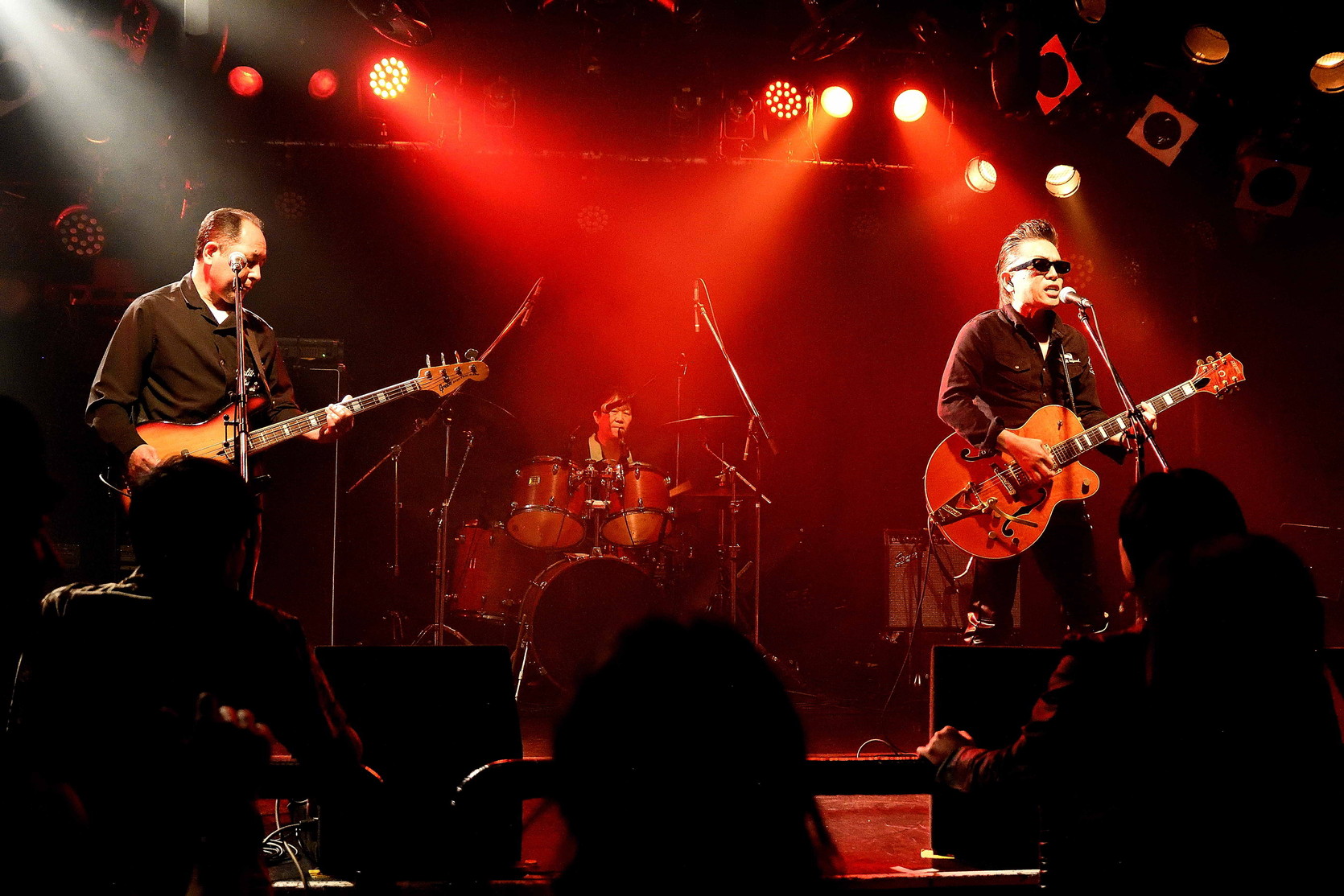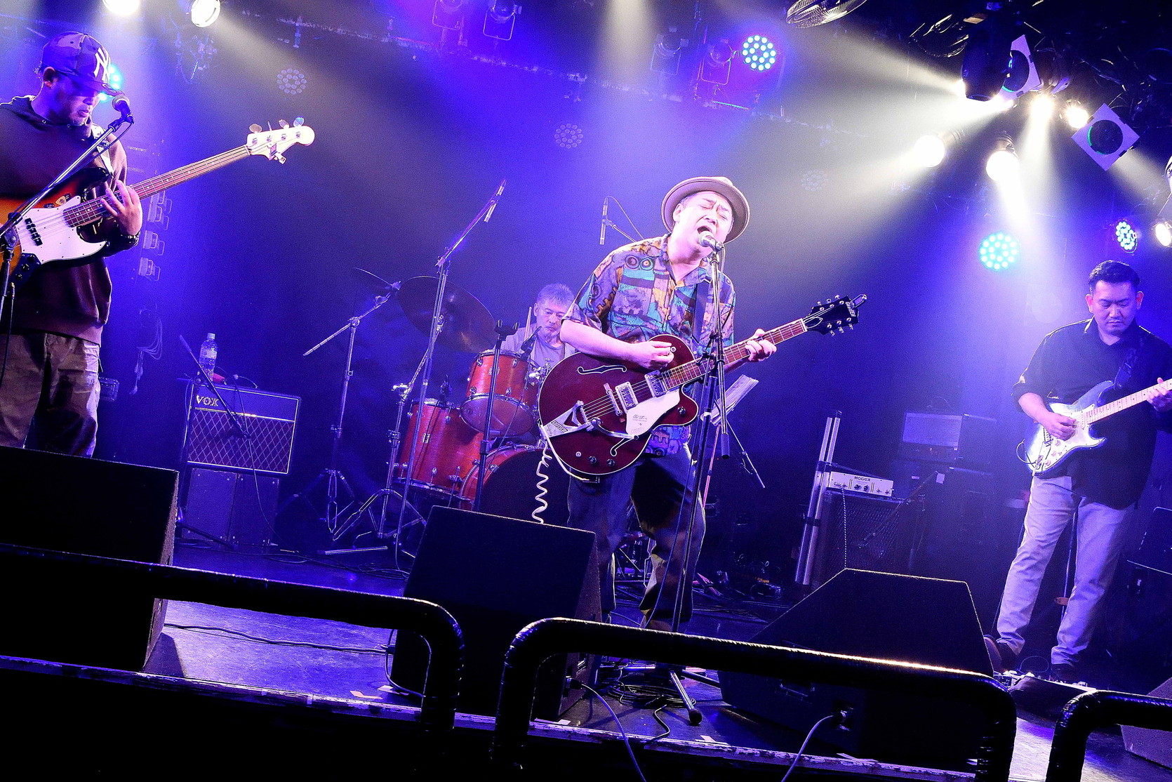 | (6)ゴールドブレンダーズ Vo(Gt),Ba,Drのトリオ編成。昭和な感じで楽しませてくれました。キャディラックのカバーから活動を開始したという事からもそのセンスが伺えるというものです。キャディラックの3曲のカバーを含め、懐かしい定番の曲をタップリと聞かせてくれました。ツッパリハイスクールロックンロール、ルイジアンナ、スニーカーブルース、ハイティーンブギ(ロカビリー調のアレンジが渋い)。 |
