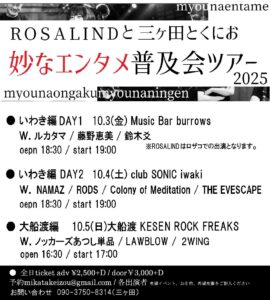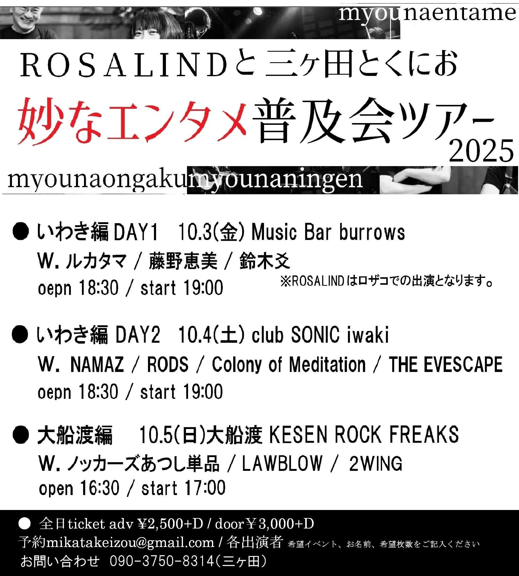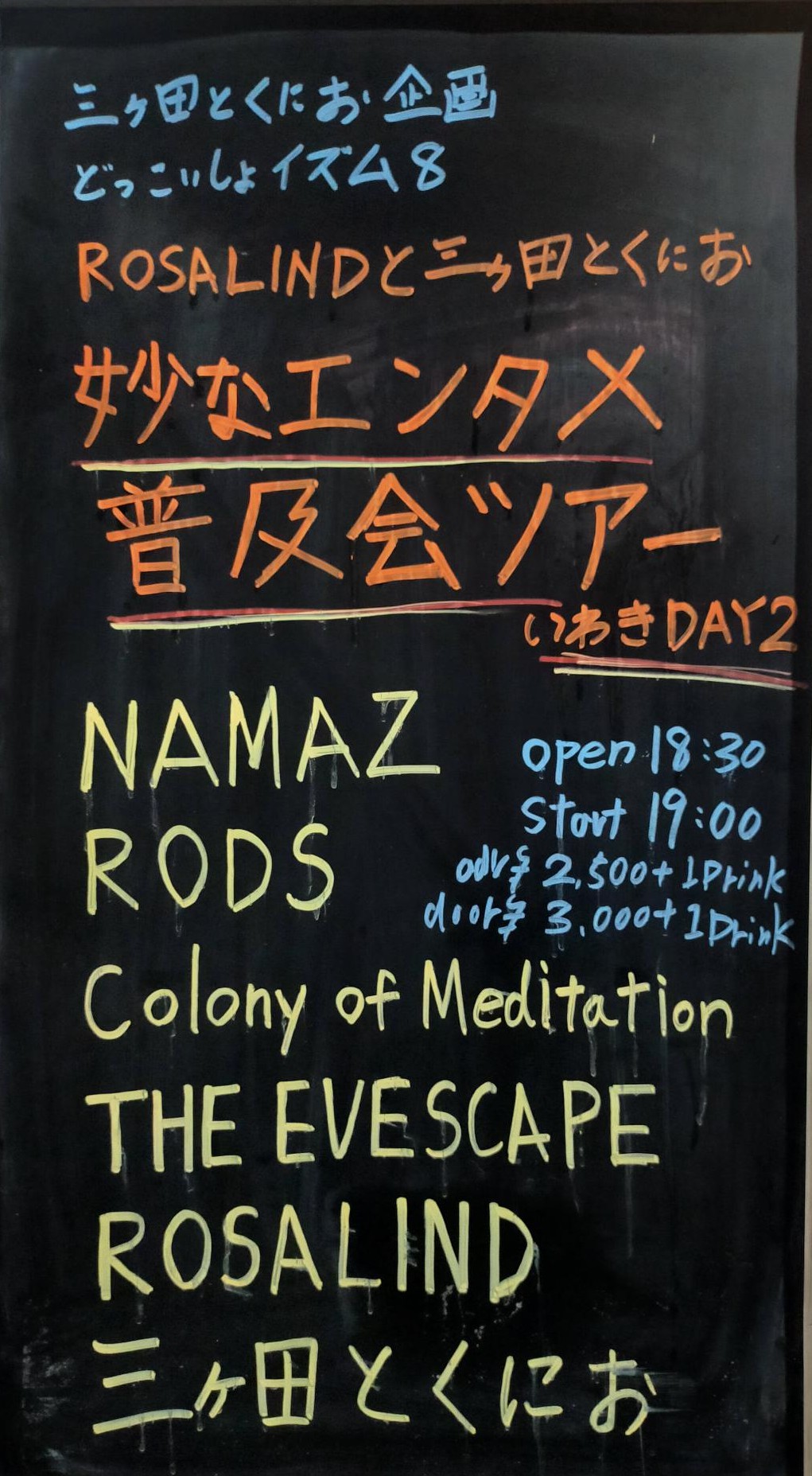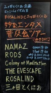 ライブレポート No.336 / ROSALIND と 三ケ田とくにお 妙なエンタメ普及会ツアー いわき編 DAY2 2025.10.4(sat)19:00〜 出演(順に) (1)THE EVESCAPE, (2)RODS,(3)Colony of Medetation,(4)ROSALIND, (5)NAMAZ,(6)三ケ田とくにお