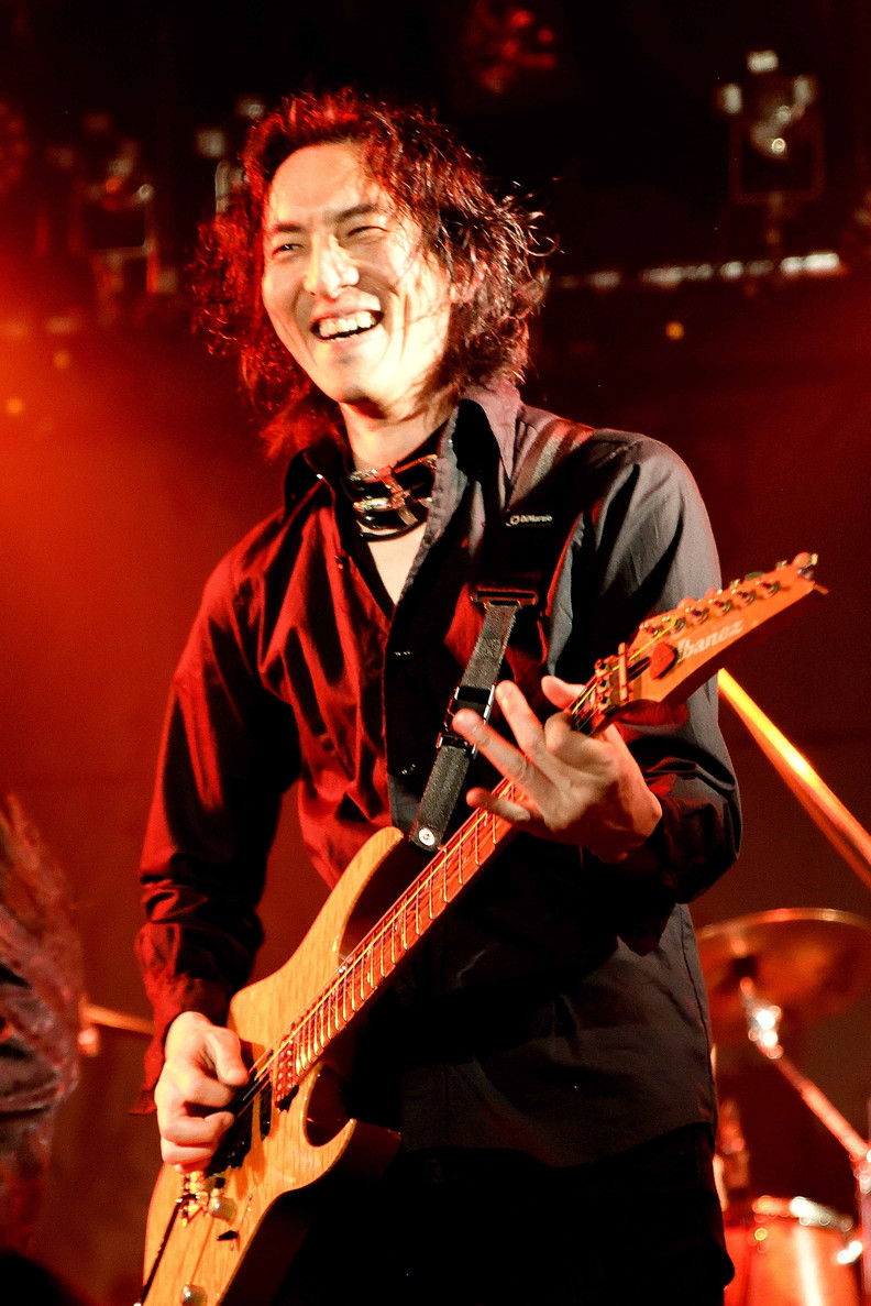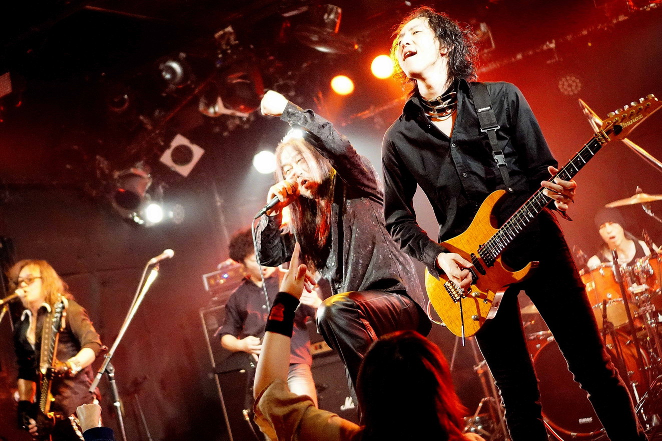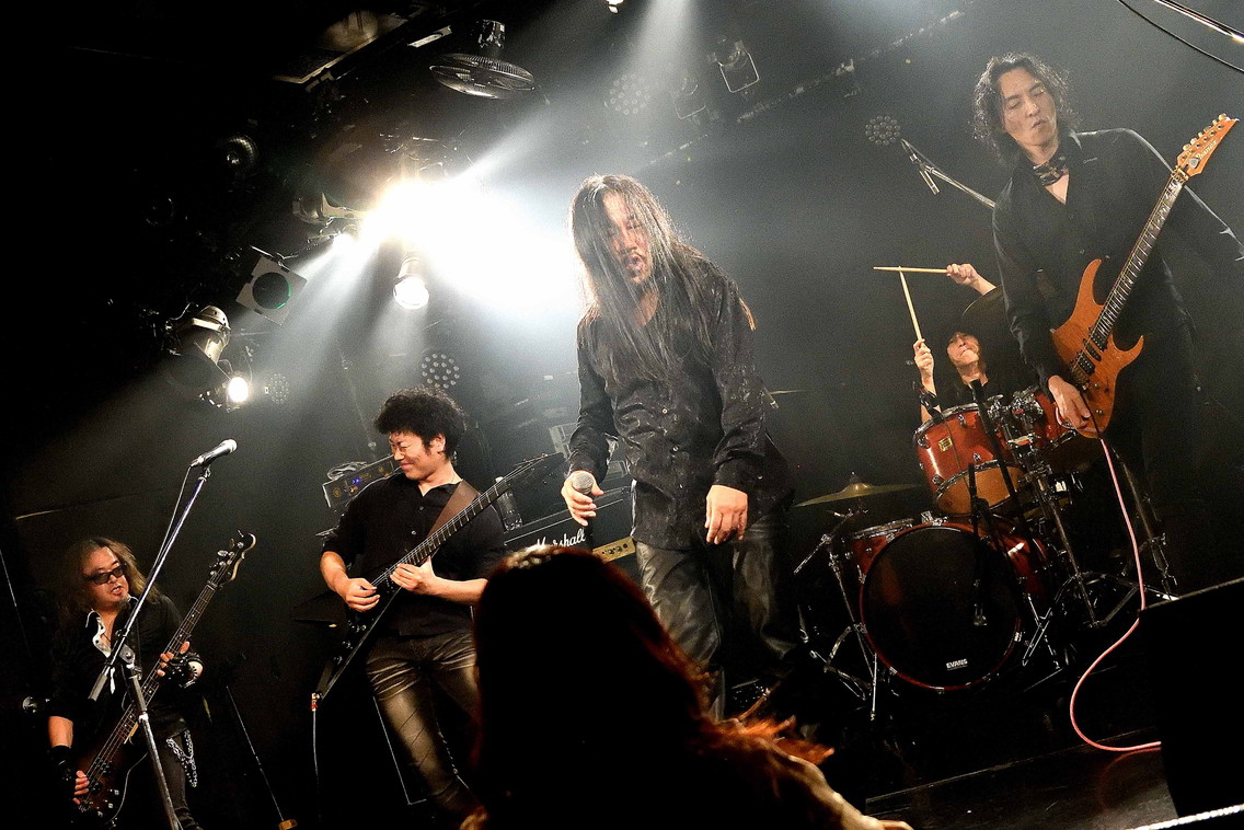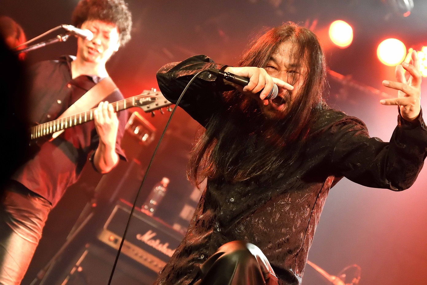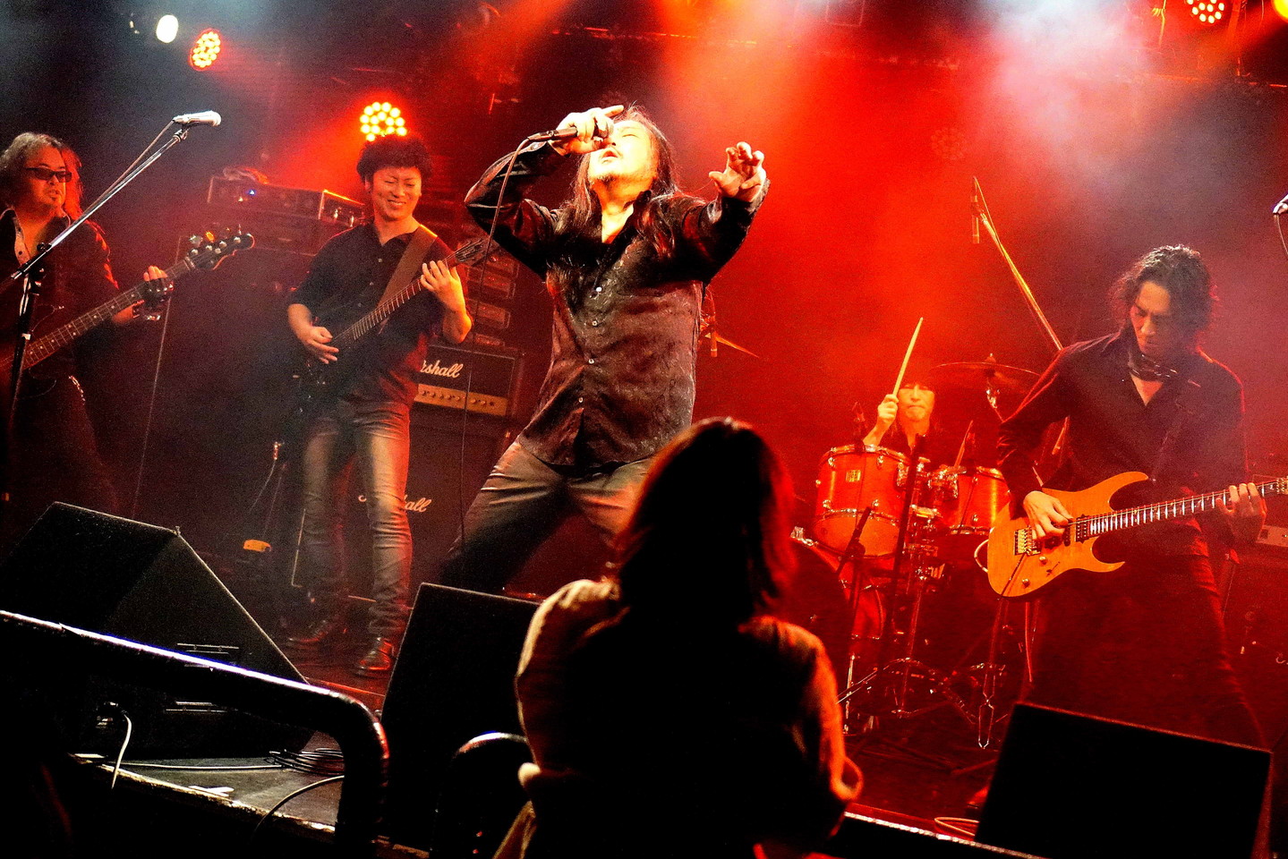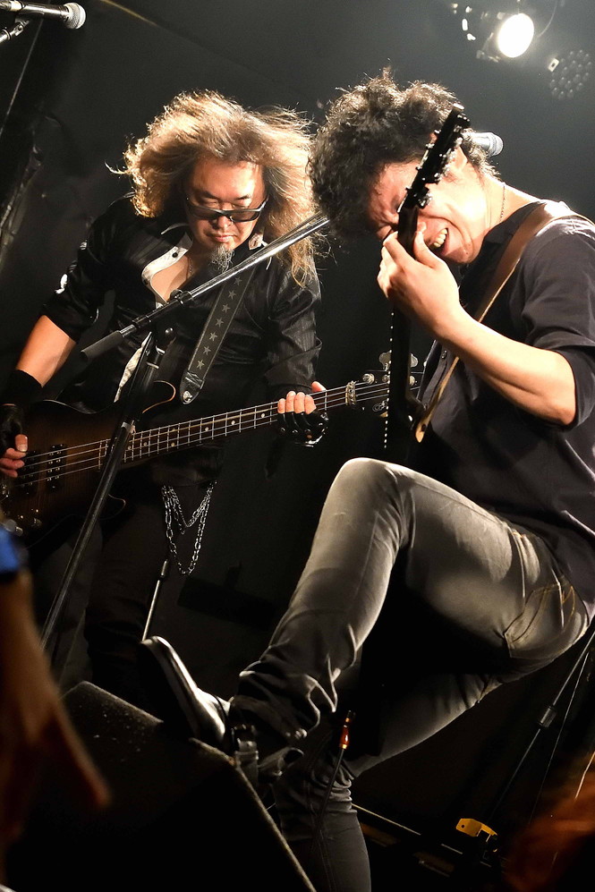 | (3)Colony of Medetation 先月20日ライブを拝見したので、二か月続けてコロニーさんのライブを拝見する機会に恵まれました。正統派へヴィ・メタル・バンドで、Vo,Gt,Gt,Ba,Drの五人編成。先月のライブでは、ボーカル松井さんが、暑い熱いとおっしゃりながら、皮製の黒のロングコート姿で歌い上げたのですが、この日は持ってくるのを忘れた、との事で黒シャツ(渋い柄が入っている模様)姿。年末に向けてライブ告知もあり、精力的な活動を行っていることが伺えますね。 |