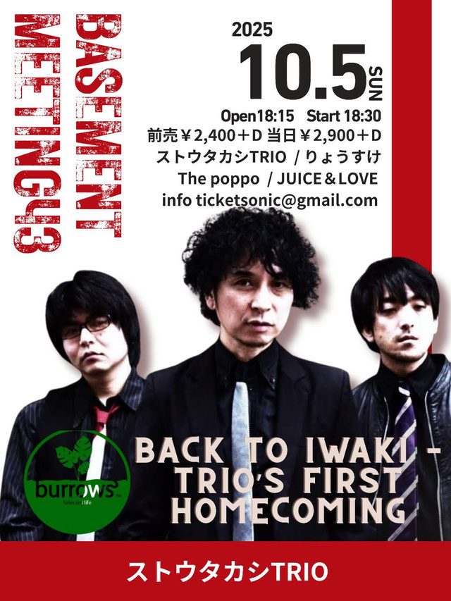 2025.10.5(sun)18:30〜 出演(順に) (1)The Poppo, (2)りょうすけ,(3)ストウタカシTRIO,(4)JUICE&LOVE