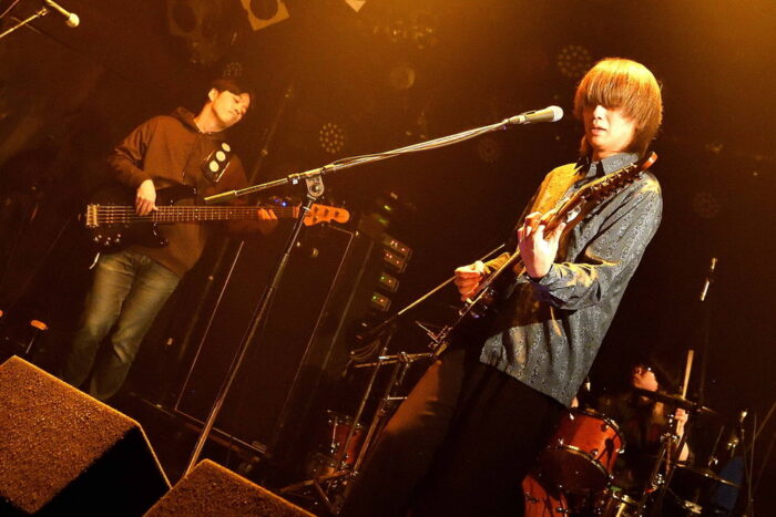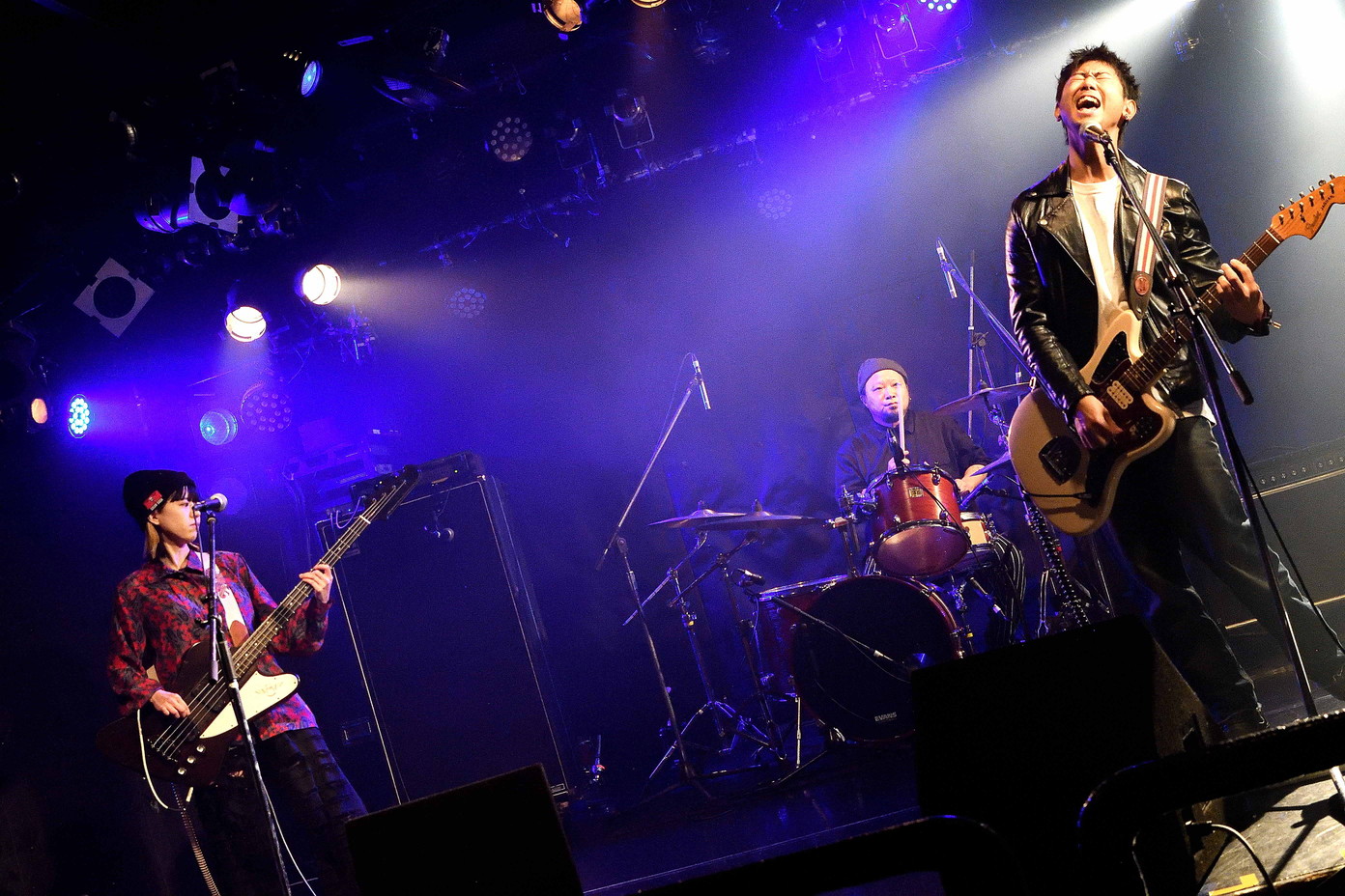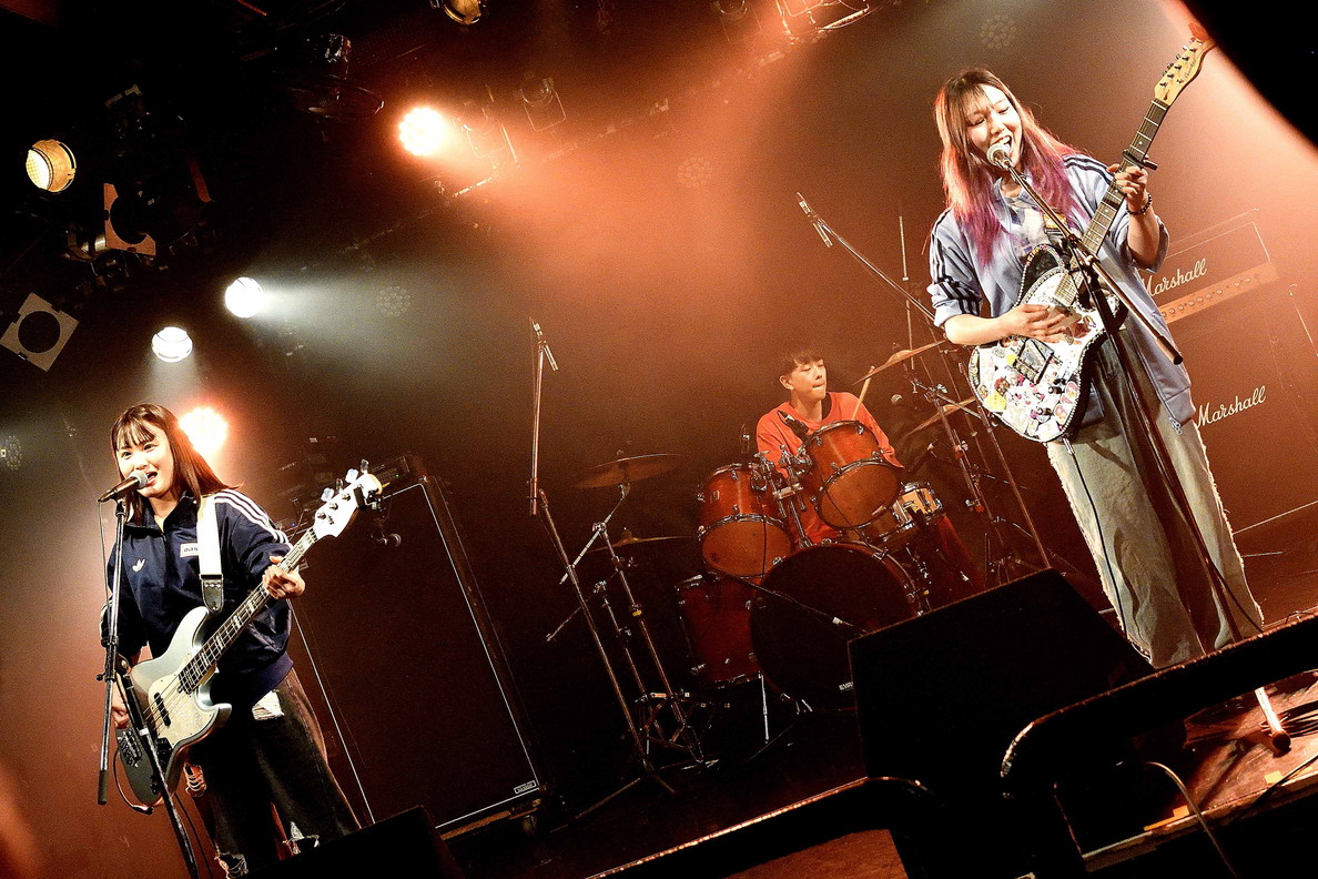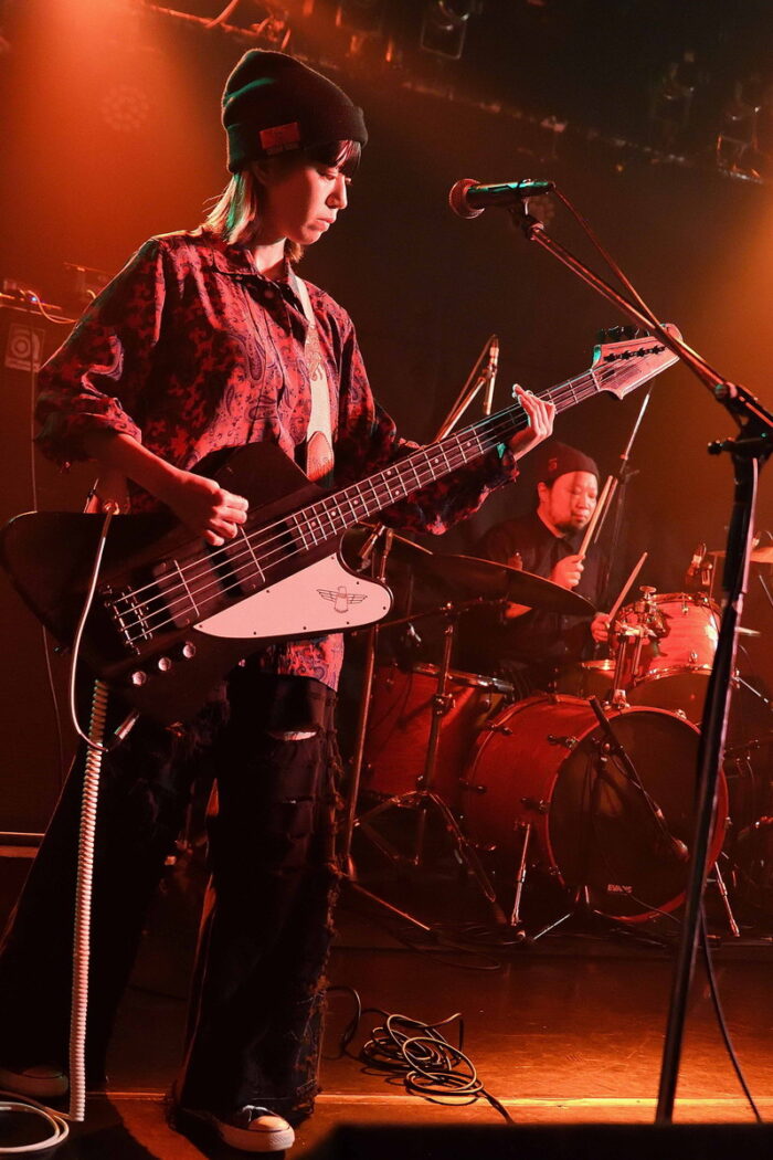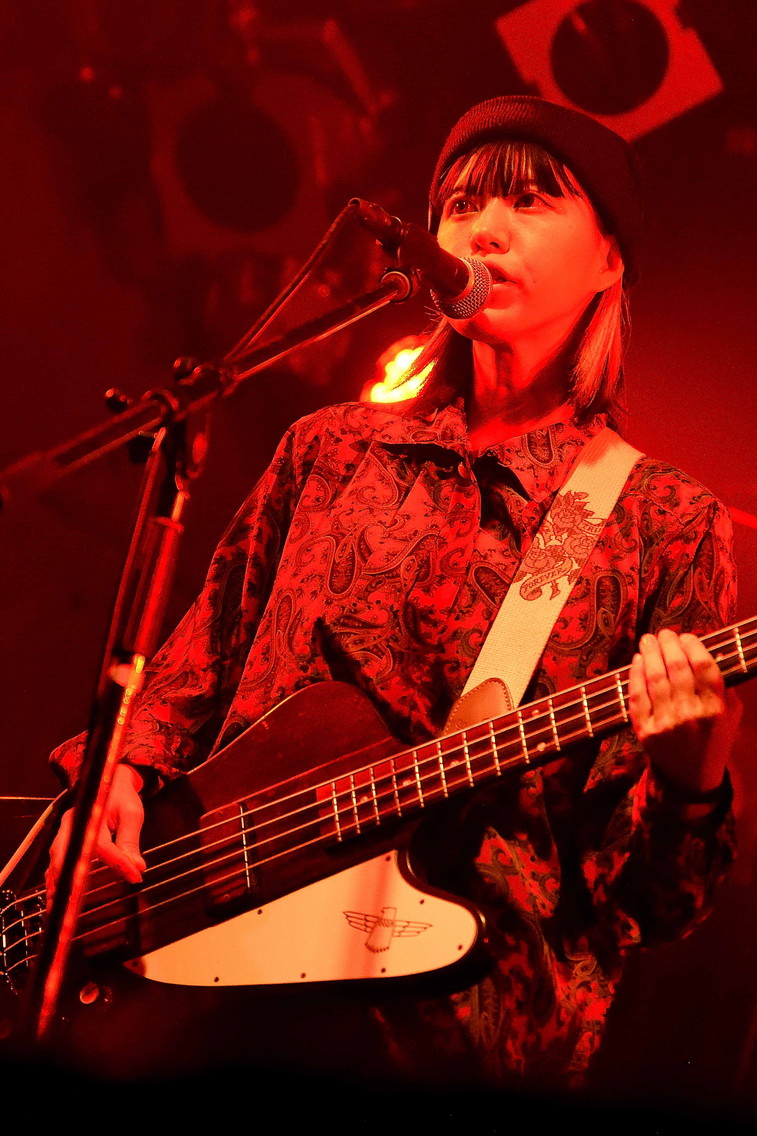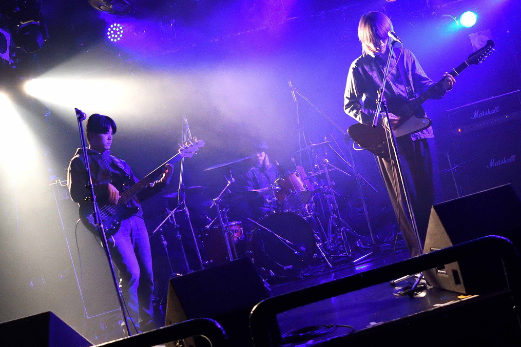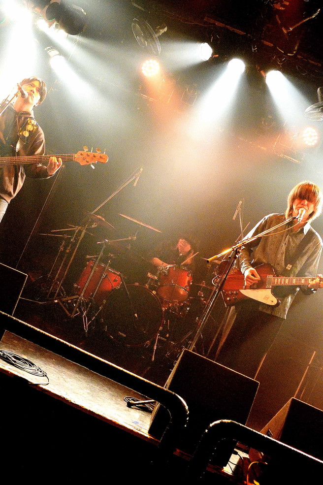 | (3)PEI Vo(Gt),Ba,Drのトリオ編成。何度かライブを拝見していますが、楽曲のタイプというかバリエーションというか曲調の多様さ幅広さには、毎度驚かされますね。オルタナティブ・ロック、ギターロックとざっくりと分類されるのでしょうが、マニア度高いなあ・・・と個人的には感じ入っております。メンバー三人三様のファッションセンスも、このバンドの魅力ですね。 |