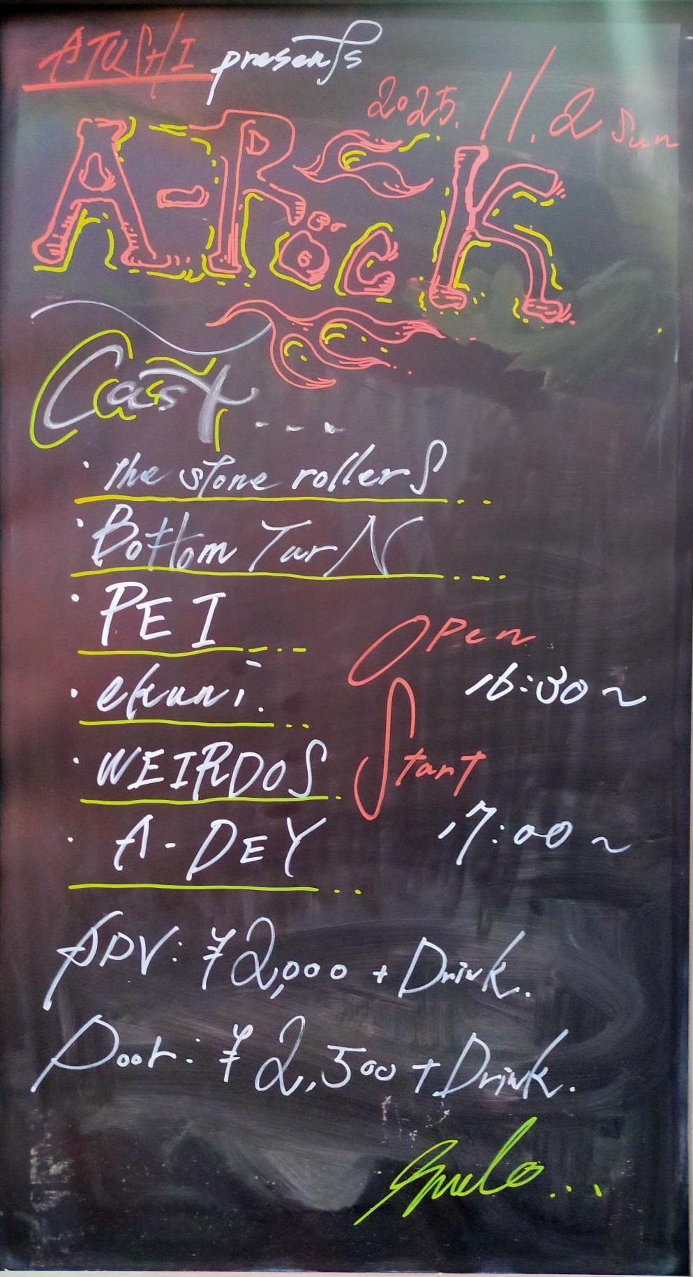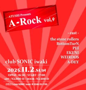 ライブレポート No.338 2025.11.2(sun)17:00〜 ATUSHI Presents A-Rock vol.9 出演(順に) (1)A-DEY, (2)The Stone Rollers,(3)PEI,(4)WEIRDOS,(5)ekuni,(6)Bottom TurN