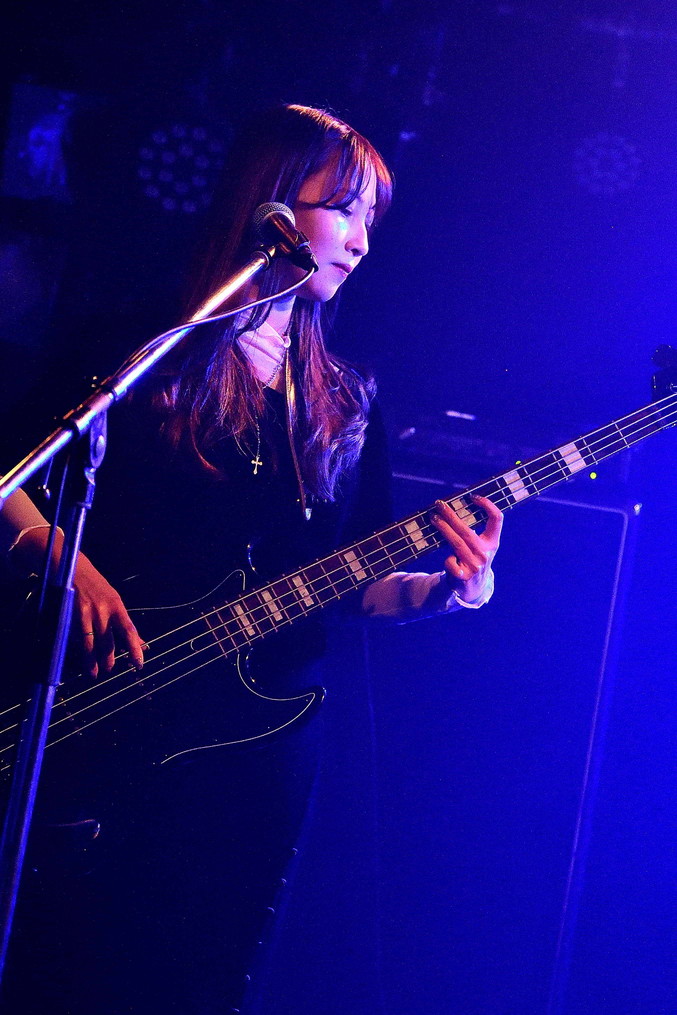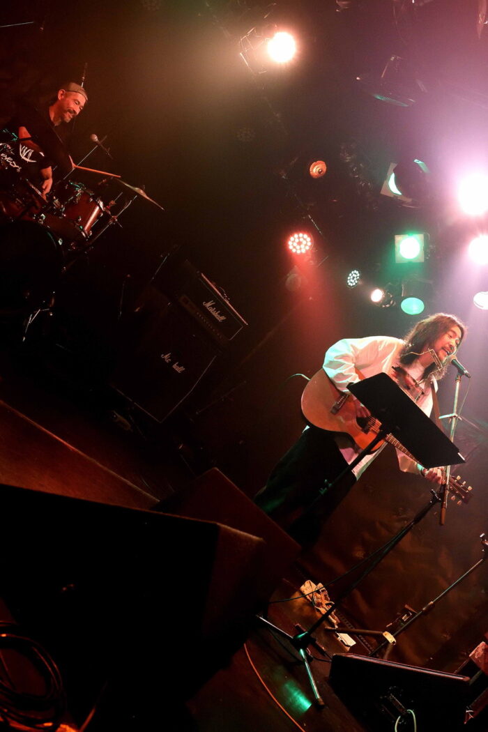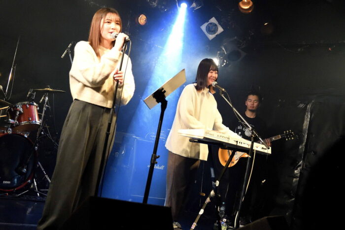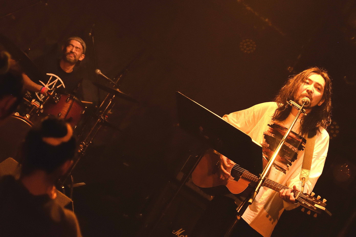| (1)echo Ba(Vo),Gt,Drのトリオ編成。ライブを拝見するのは、結構久しぶりのような気がします。メンバーも何かと御忙しい時期かもしれませんが、こうやってライブを見れる事に感謝してライブ観戦に挑みます(苦笑)。いつに無くリラックスした表情で聴かせる歌声に心奪われました。 |