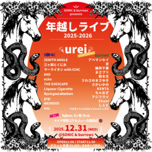 | (5)urei/カウントダウン いやあ、盛り上がりましたねえ、弾けましたねえ、素晴らしいカウントダウンでした。ウレイの結成は2018年とのことですから、いわゆるコロナ禍(2020年~2022)の影響を強く受けざるを得なかったかと思います。バンド結成から1,2年という時期はロックバンドの成長~発展の時期としては極めて大事な時期であることが多いでしょう。2026年の大活躍を祈念記念です。